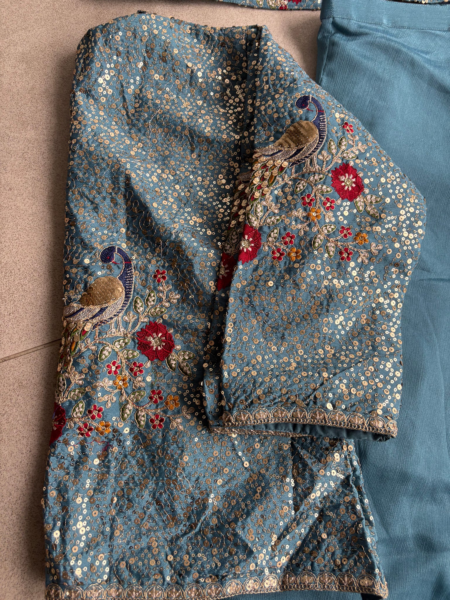 ( LATEST TRENDY FRONT AND BACK EMBROIDERED SHORT JACKET WITH MITROR WORK WITH PLAZZO AND EMBROIDERED BLOUSE )