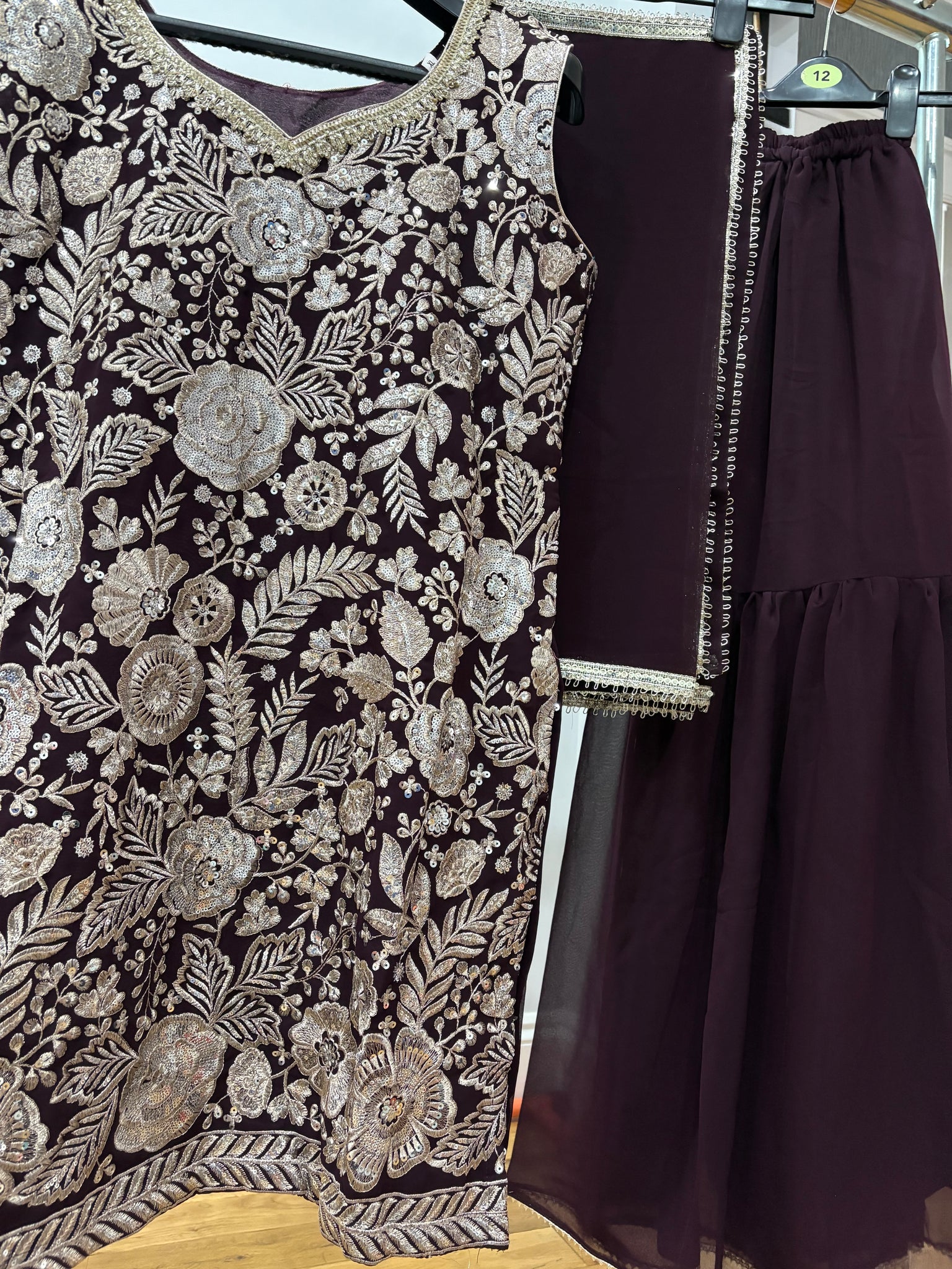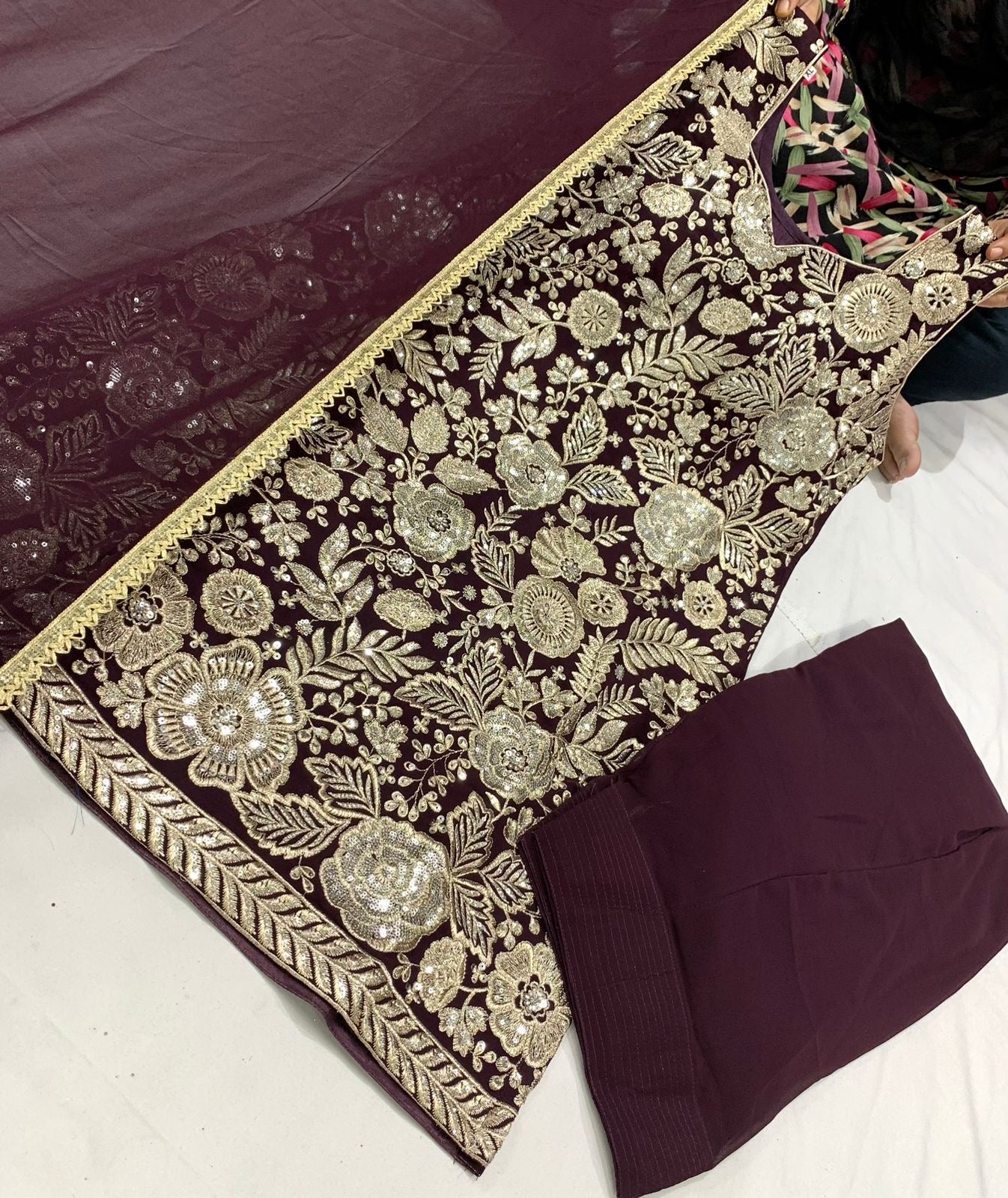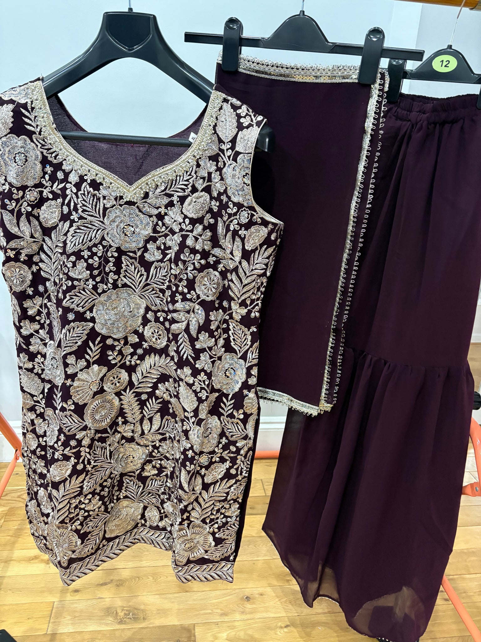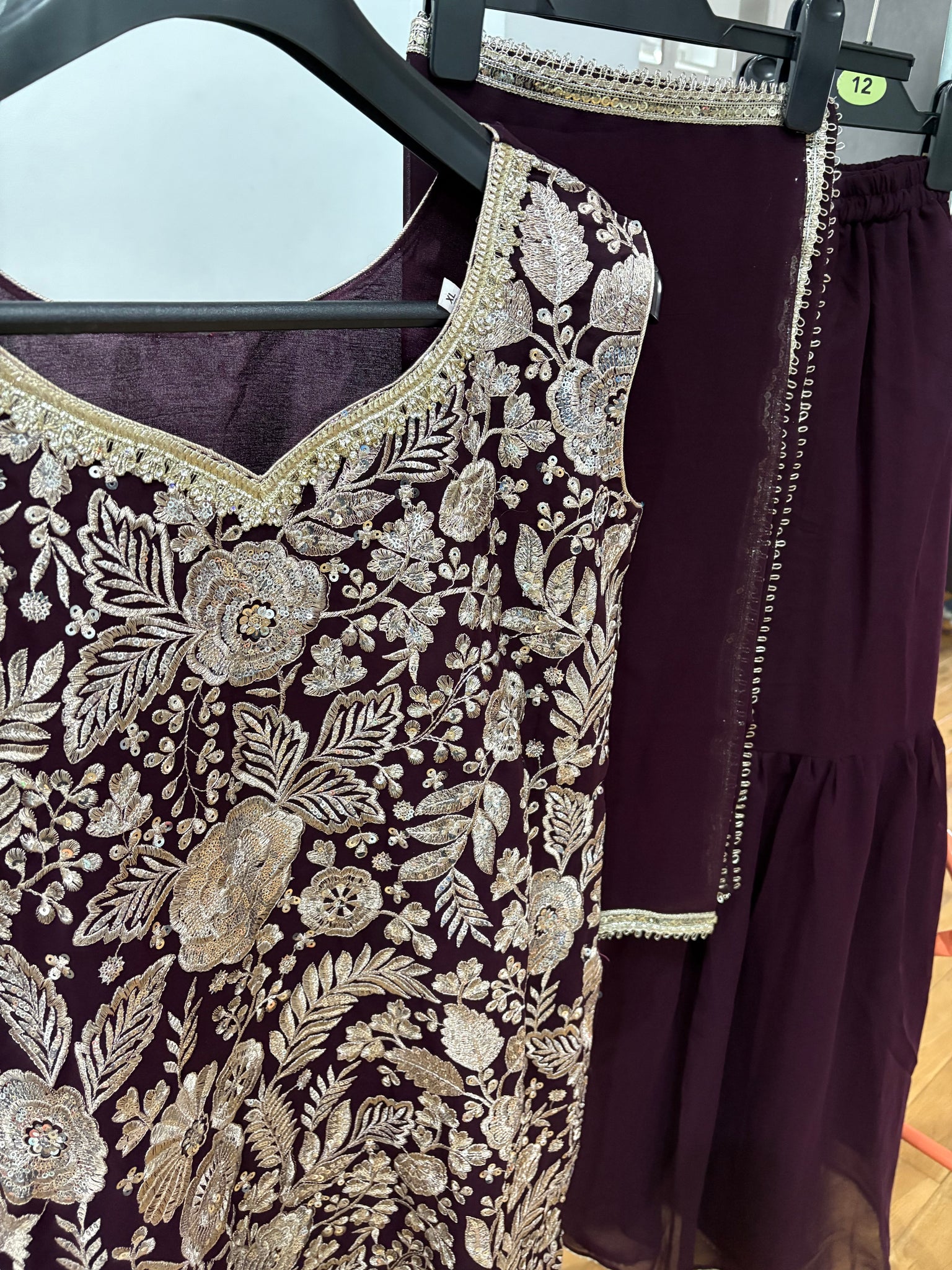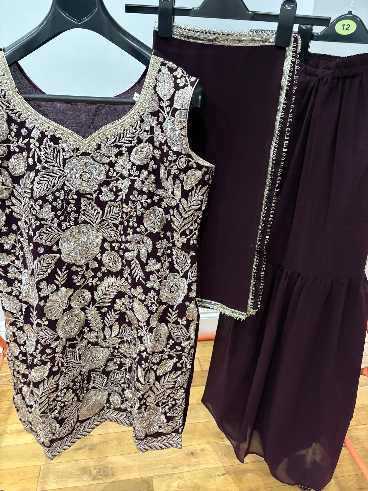 Top in geprgette embroidered with thread and sequins. Chiffon sleeves attached. Sharara flowy pants in geprgette.