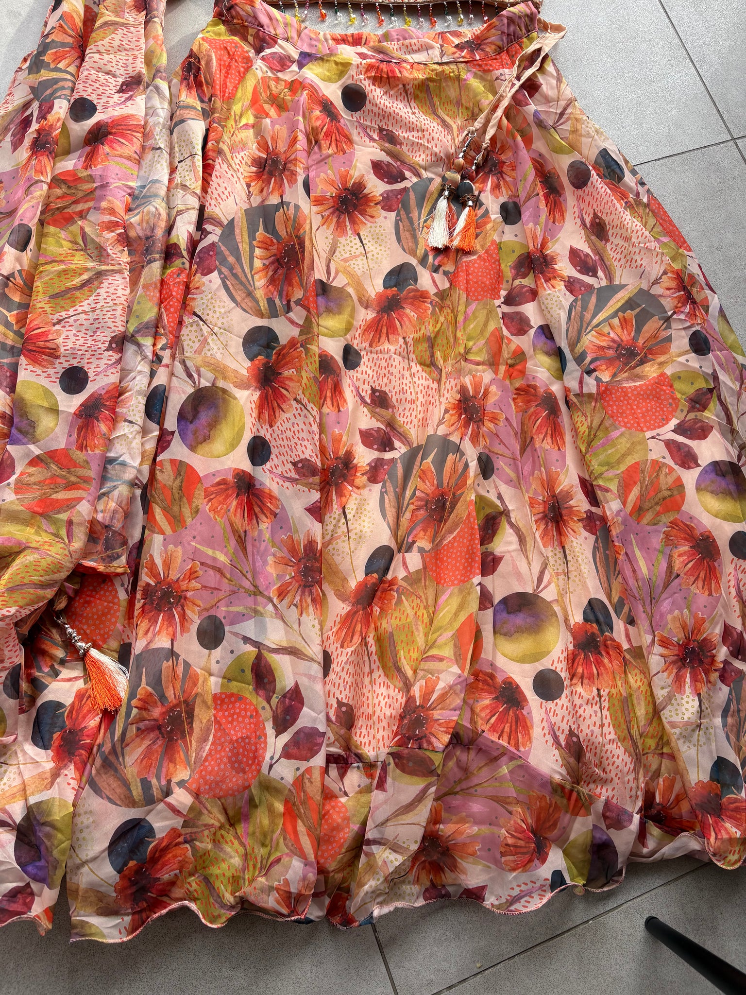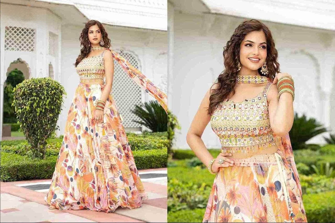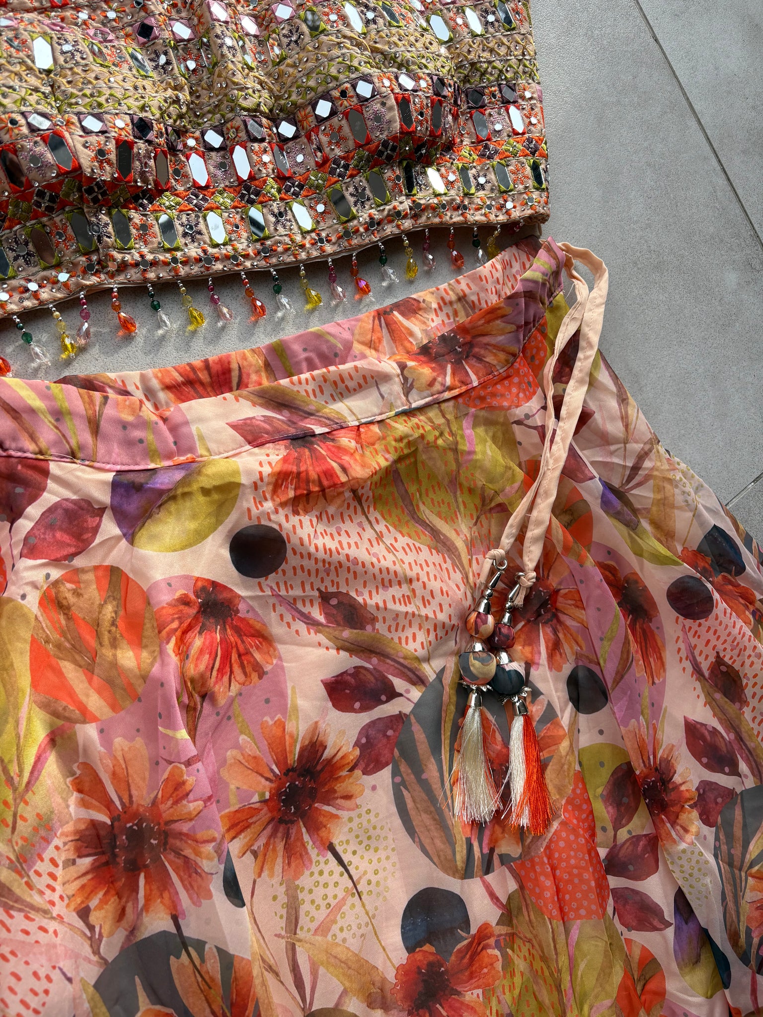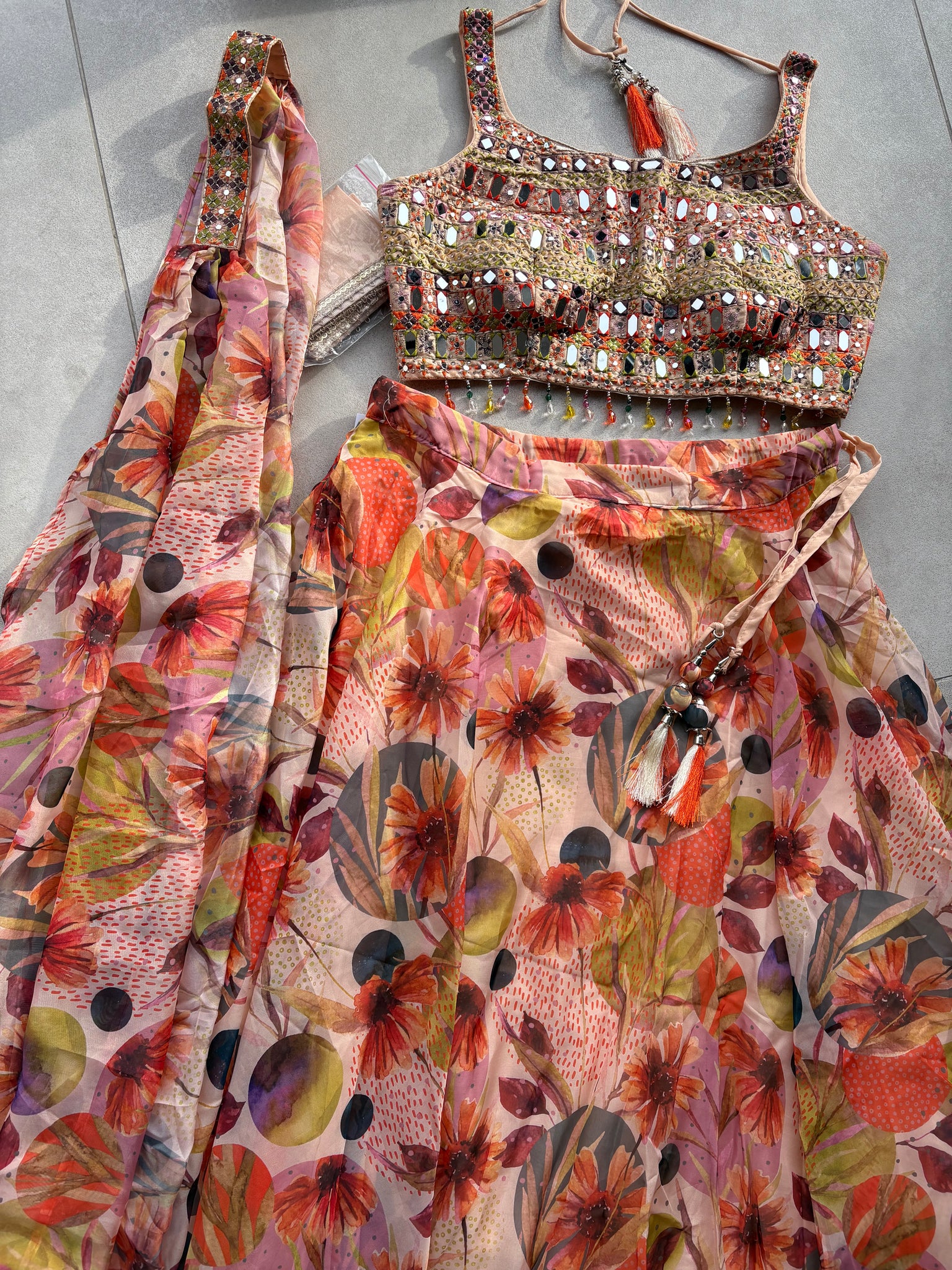 Georgette Lehenga with silky feel, embroidered blouse and necklace georgette dupatta. Blouse embroidered with mirror work and sequins.