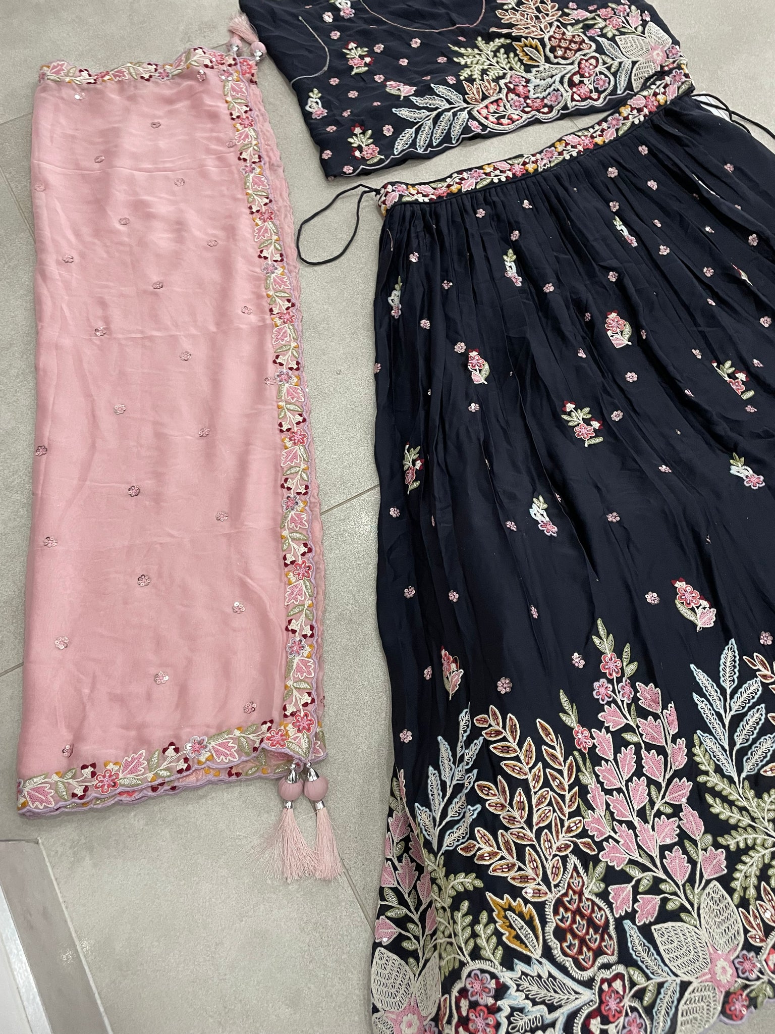 Semi stitched to fit up to 40 waist and bust. Skirt has cancan inner lining.