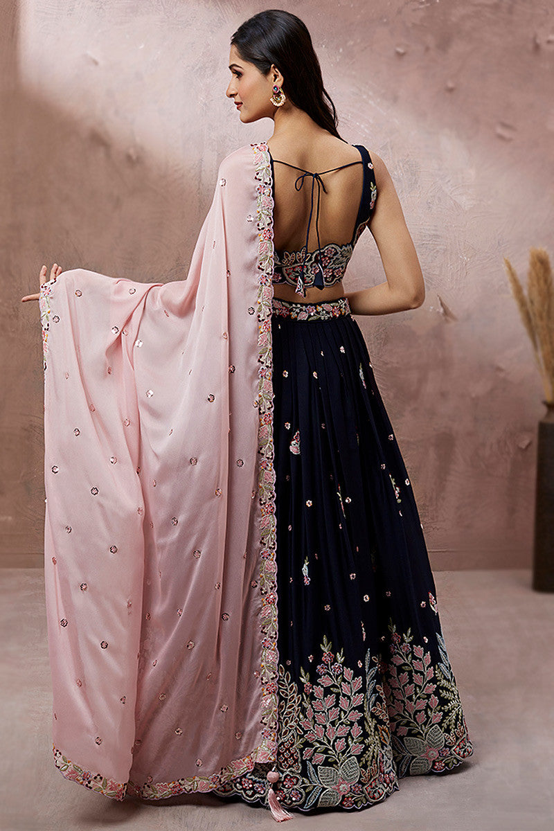 Navy blue dori embroidered silk Lehenga