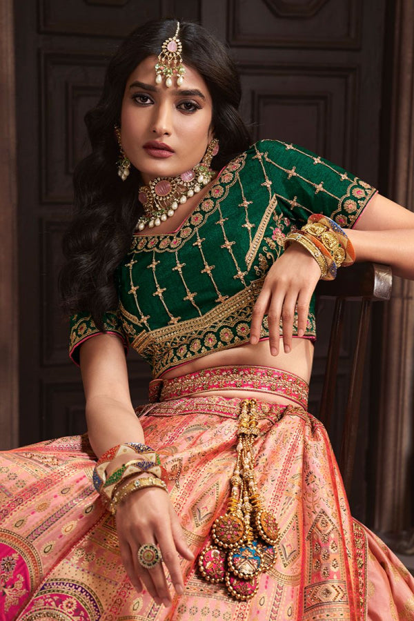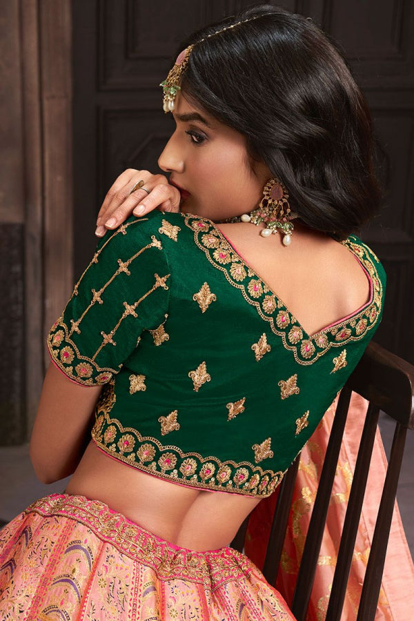 Royal collection- coral pink and bottle green banarasi silk Lehenga