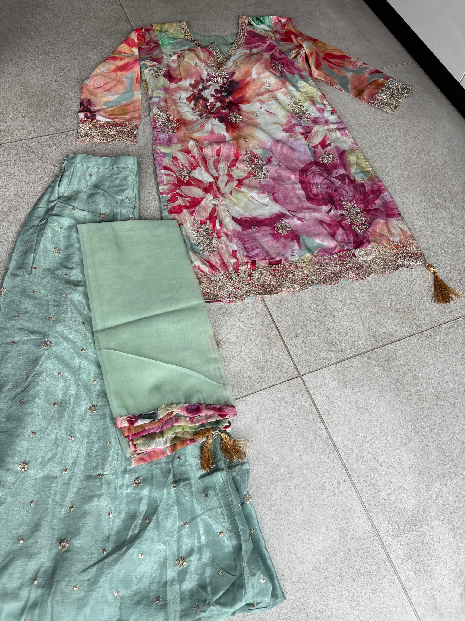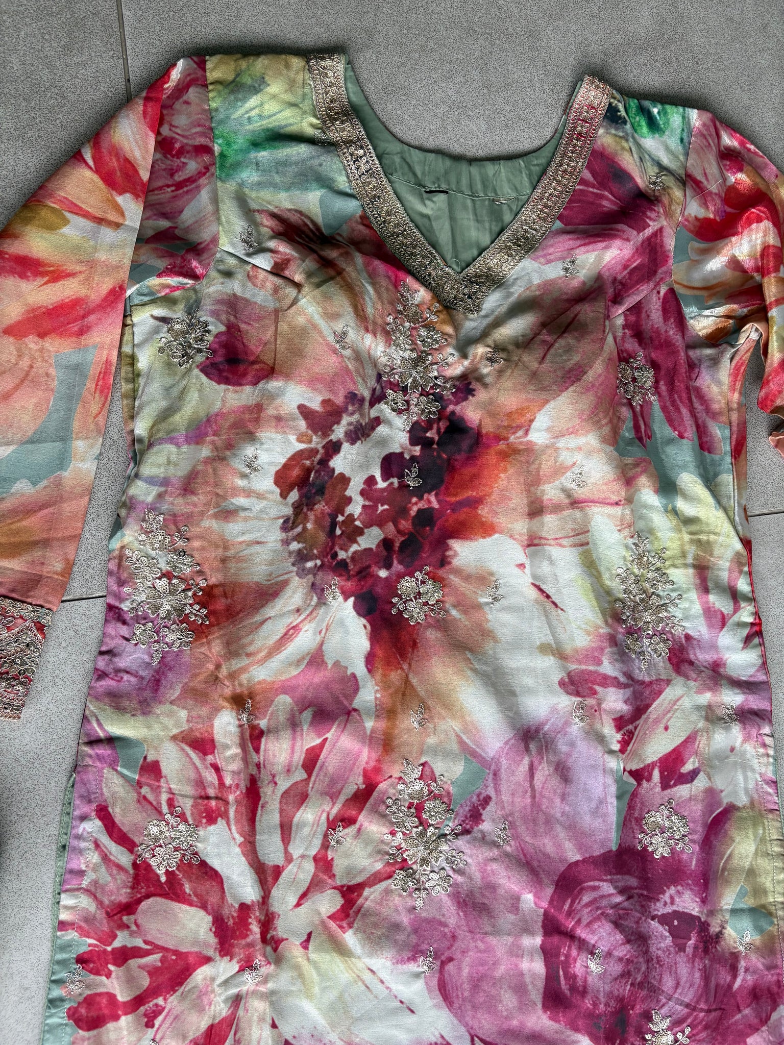 Pants stitched to waist 30” and can be stretched up to waist 40” (elastic waist). Length 41”
