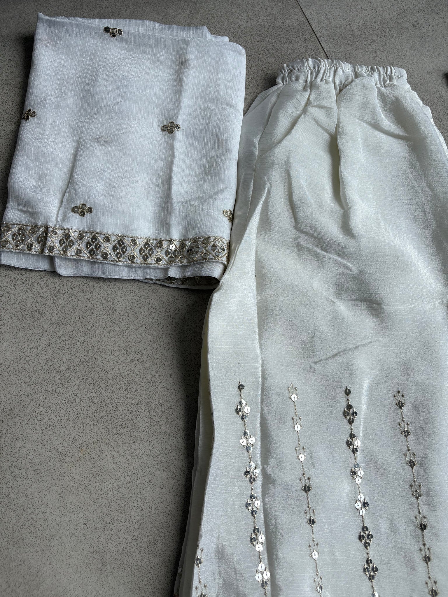 Top in georgette embroidered with thread and sequins. Chiffon sleeves attached. Sharara style pants in Georgette.