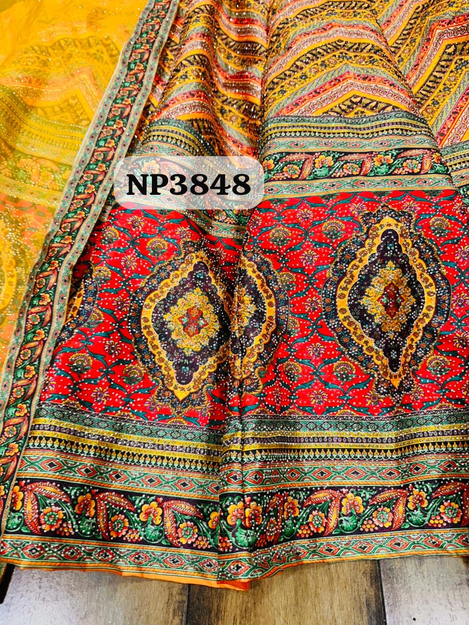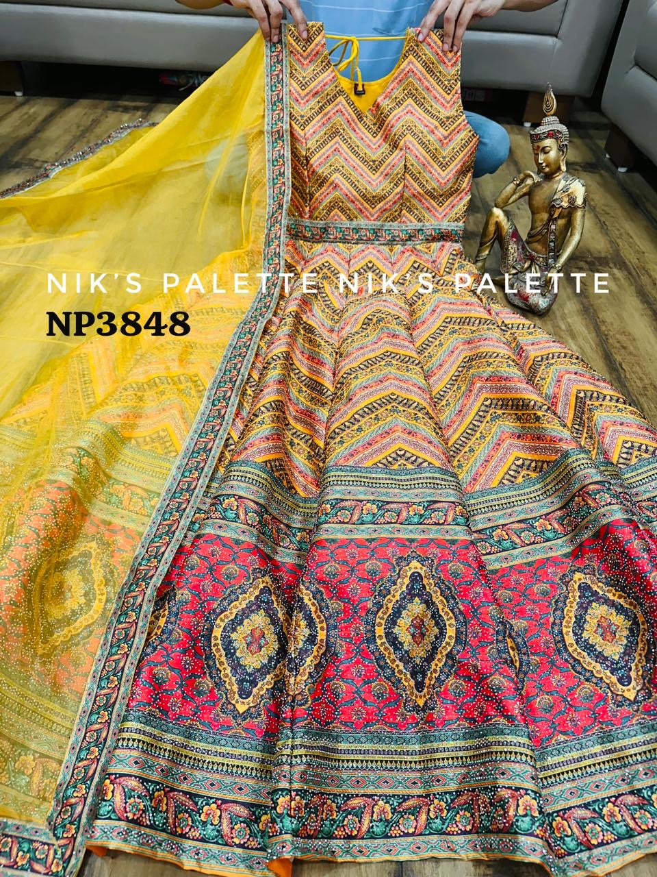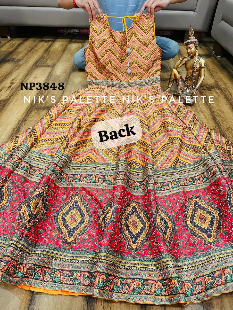 Premium silk with fusing digital print anarkali gown and dupatta detailed with all over dew drop and work Full lining and cancan attached Organza dupatta with border