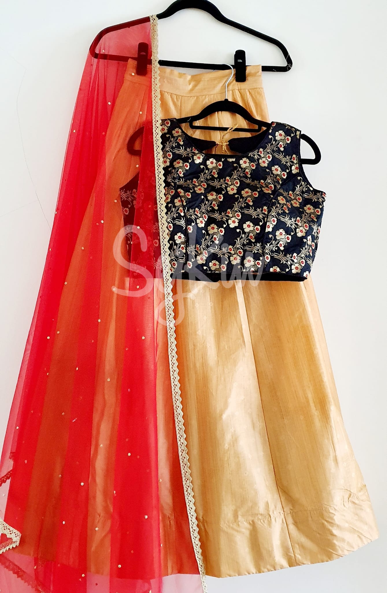 Black floral raw silk blouse with gold raw silk skirt. Paired with red net dupatta.