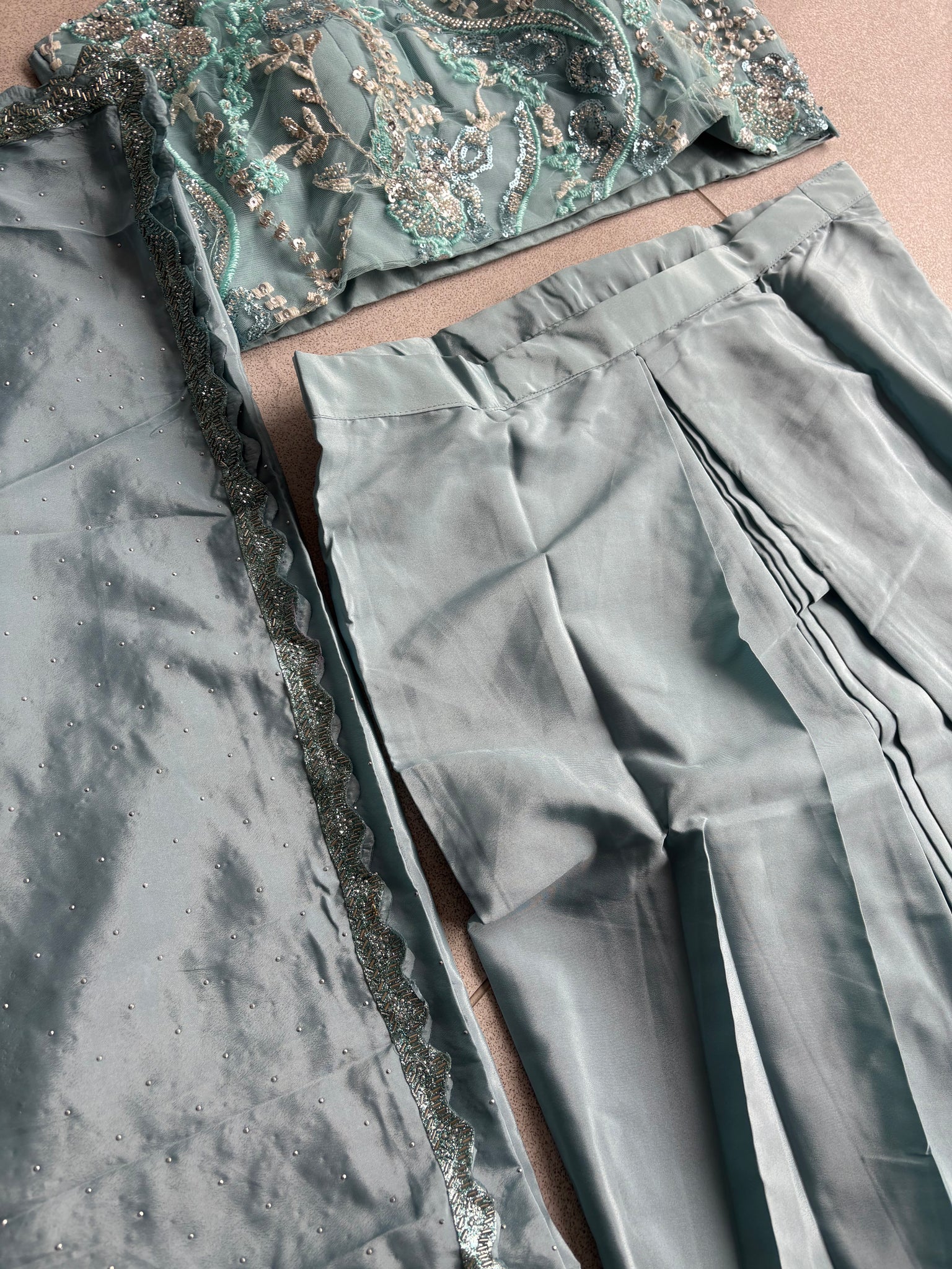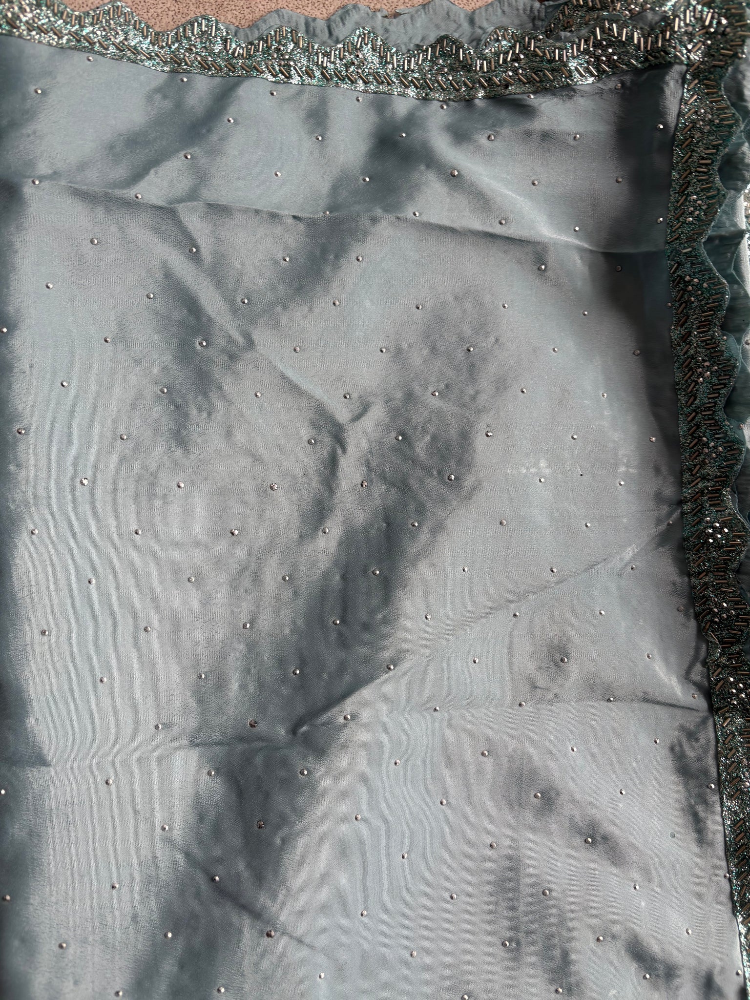 georgette material. Embellished blouse with threads and sequin work. Georgette silk skirt with front pleats. Georgette silk cape with all over diamontes.
