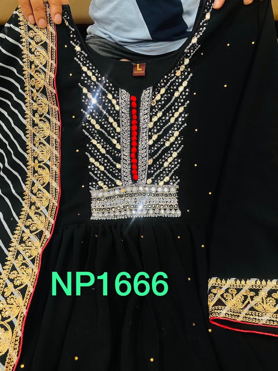 Premium Black Real Georgette tire pattern gown detailed with beautiful zari embroidery mirror & sequence work on yoke & badla work all over paired with Goergette lehriya duppata with four side zari border & sequence work....