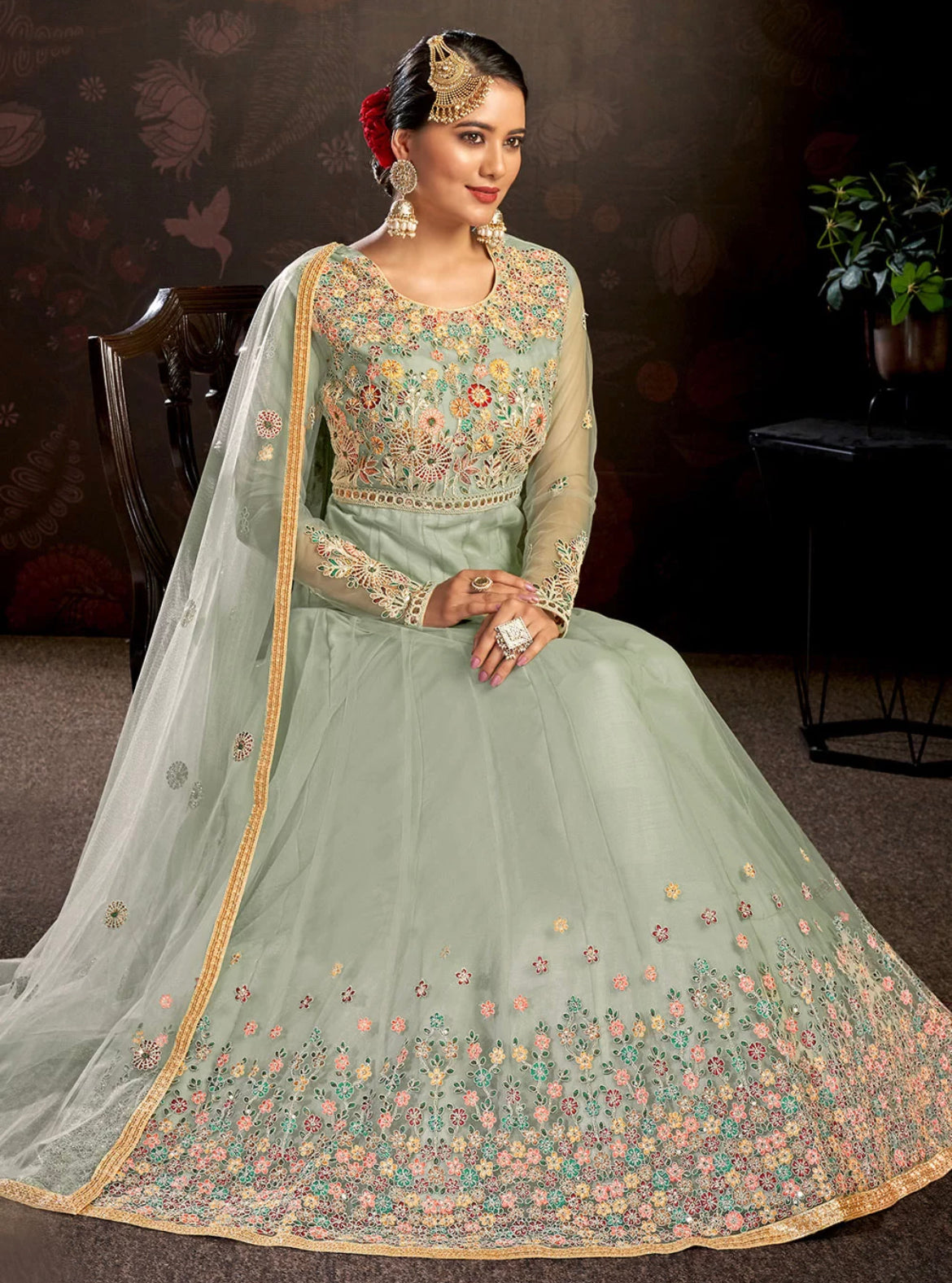 Butterfly net top semi stitched with embroidery, unstitched bottoms and lining in dull santoon. It comes with a butterfly net dupatta with embroidery.