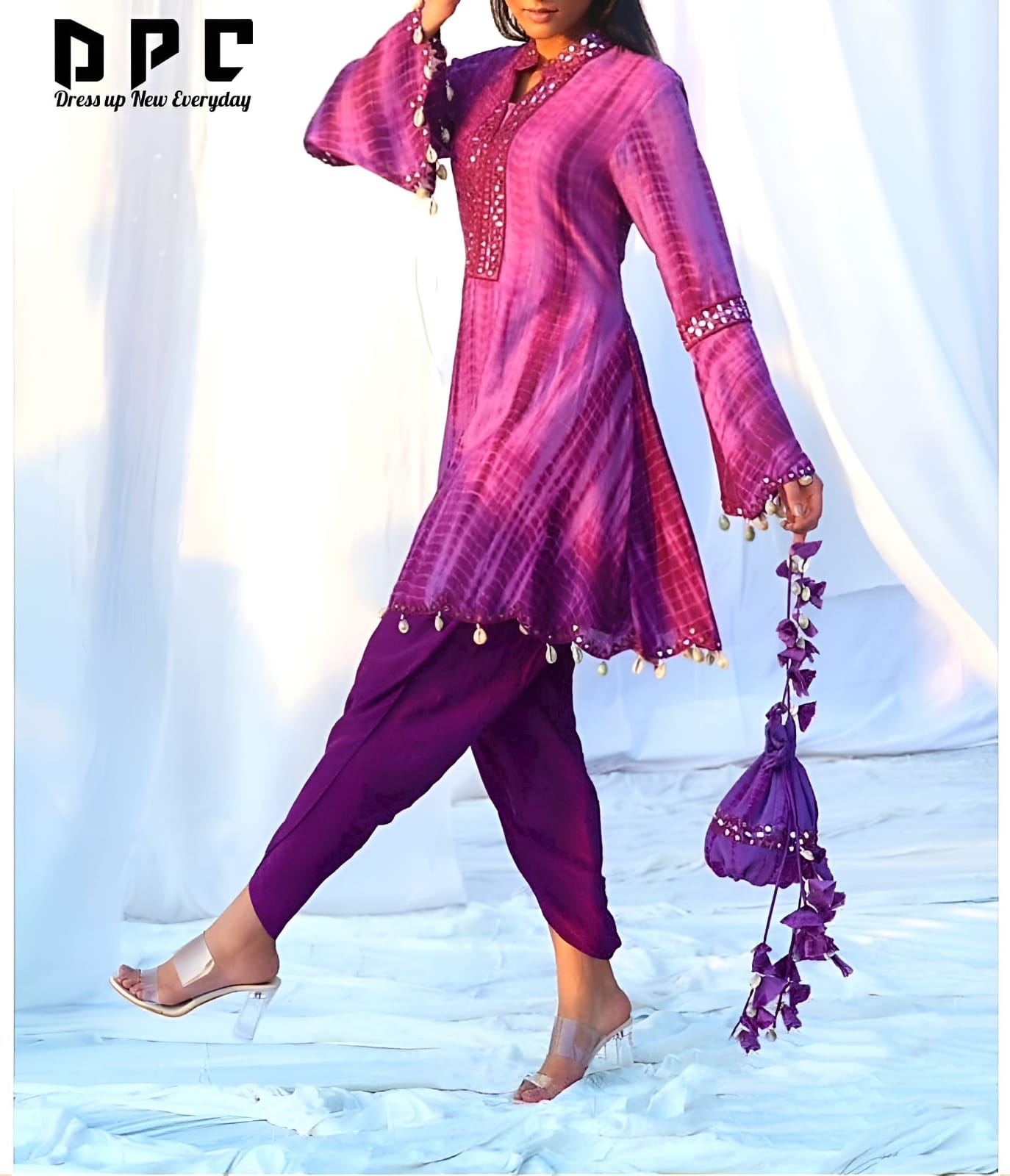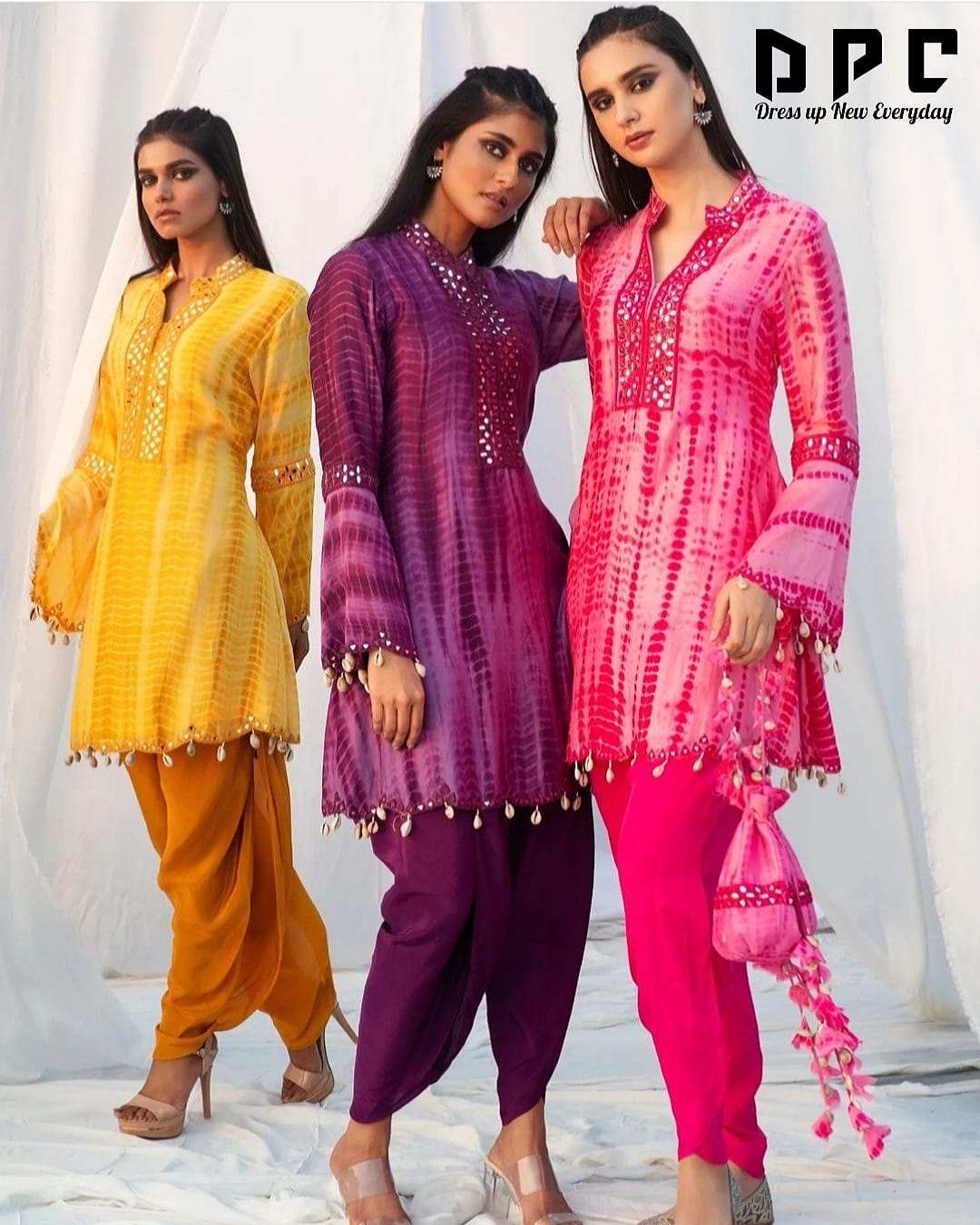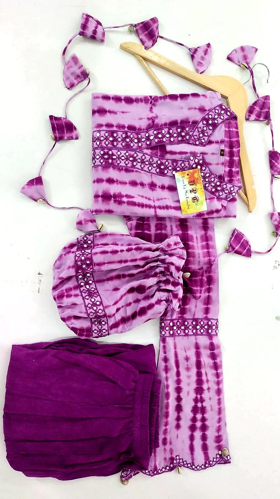 Special Dhoti Sets in 3 Amazing colours crafter Hand Tie Dyed Fabric with Embellished with Mirror Embroidery on Neck and Sleeves with a Bell pattern, Lace on Kurti Border and sleeves Border with Cutwork and Mirror work over them paired up with Dhoti*