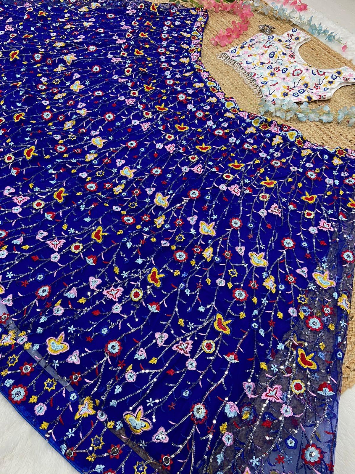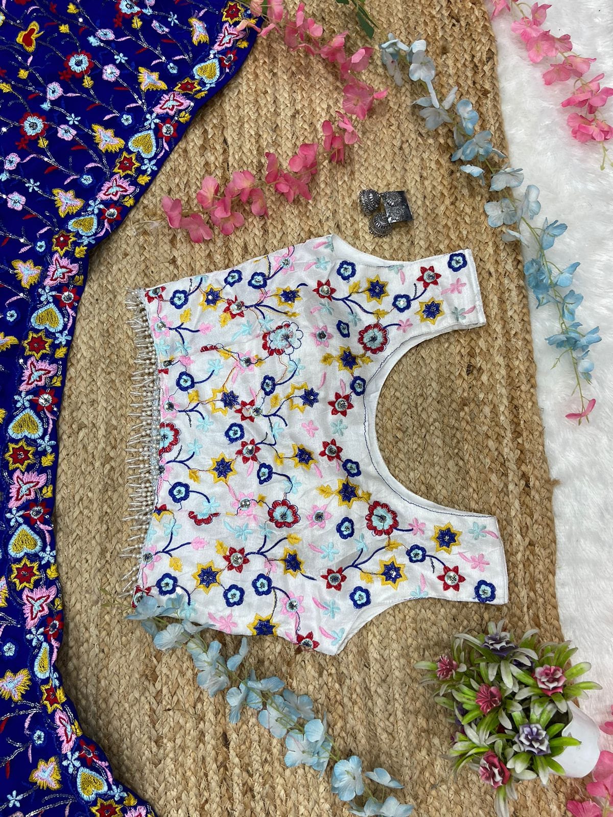 Blouse : *Premium Mono Silk Embellished With Beautiful Multicolour Thread Embroidery And Sequins,Work Both Side Work Front And Back With Beautiful Latkan Lace For Front And Back*( Unstitched )