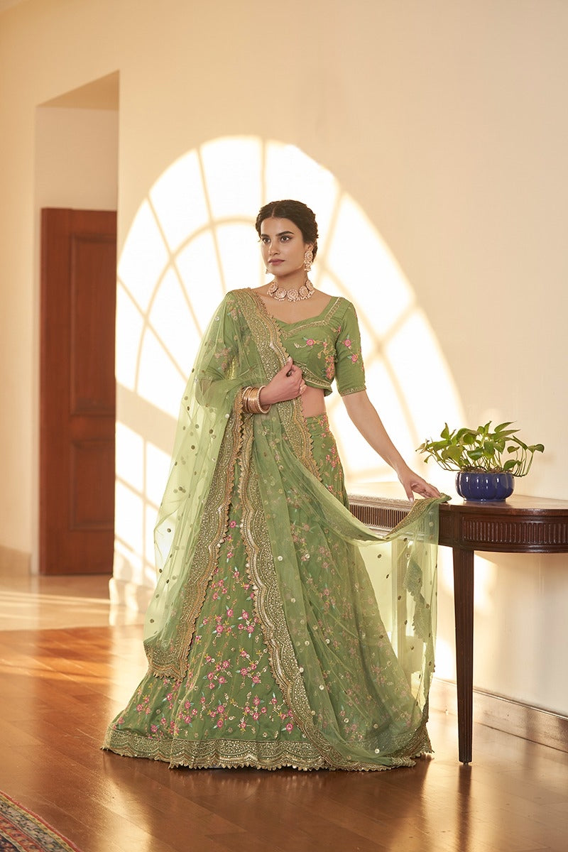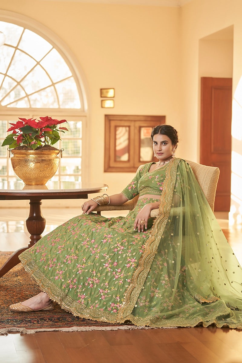 Chinon silk floral multi thread and sequin Lehenga in mehendi green