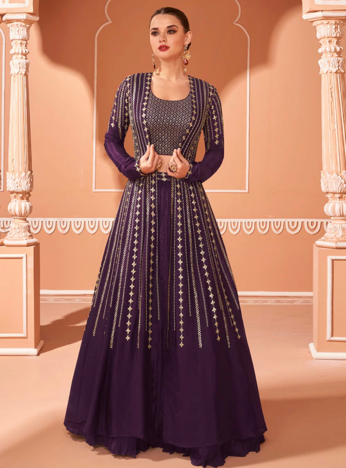 Janisha - chinnon embroidered deep purple Lehenga choli with koti