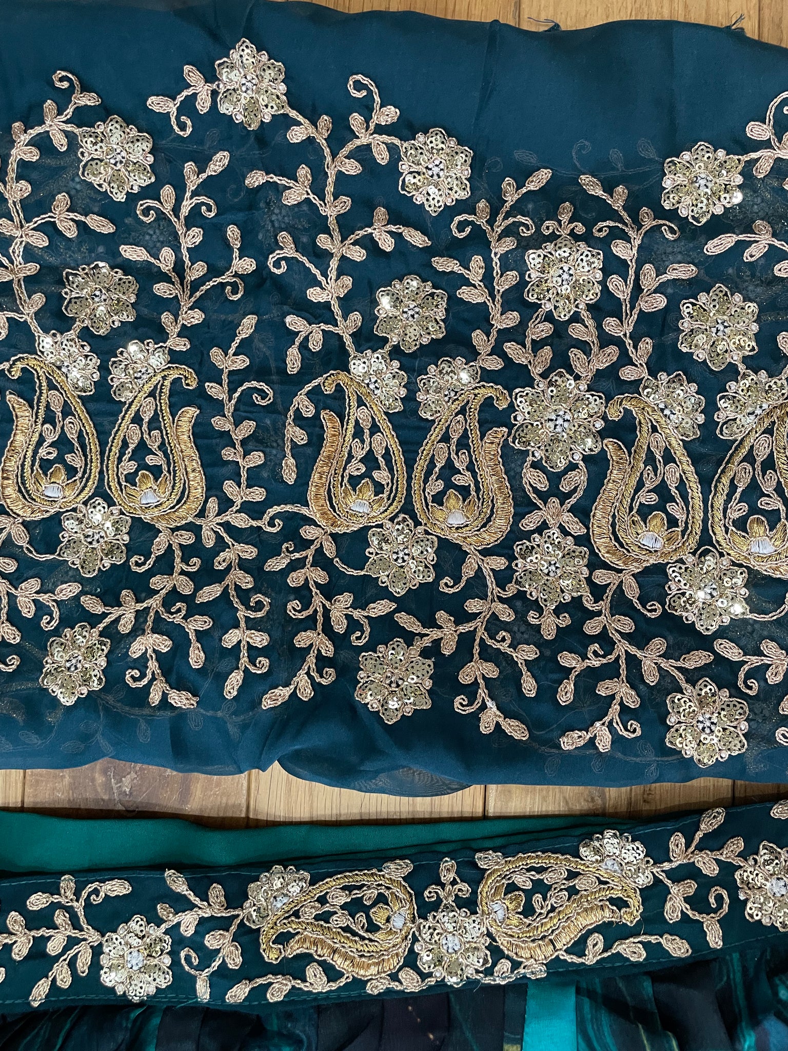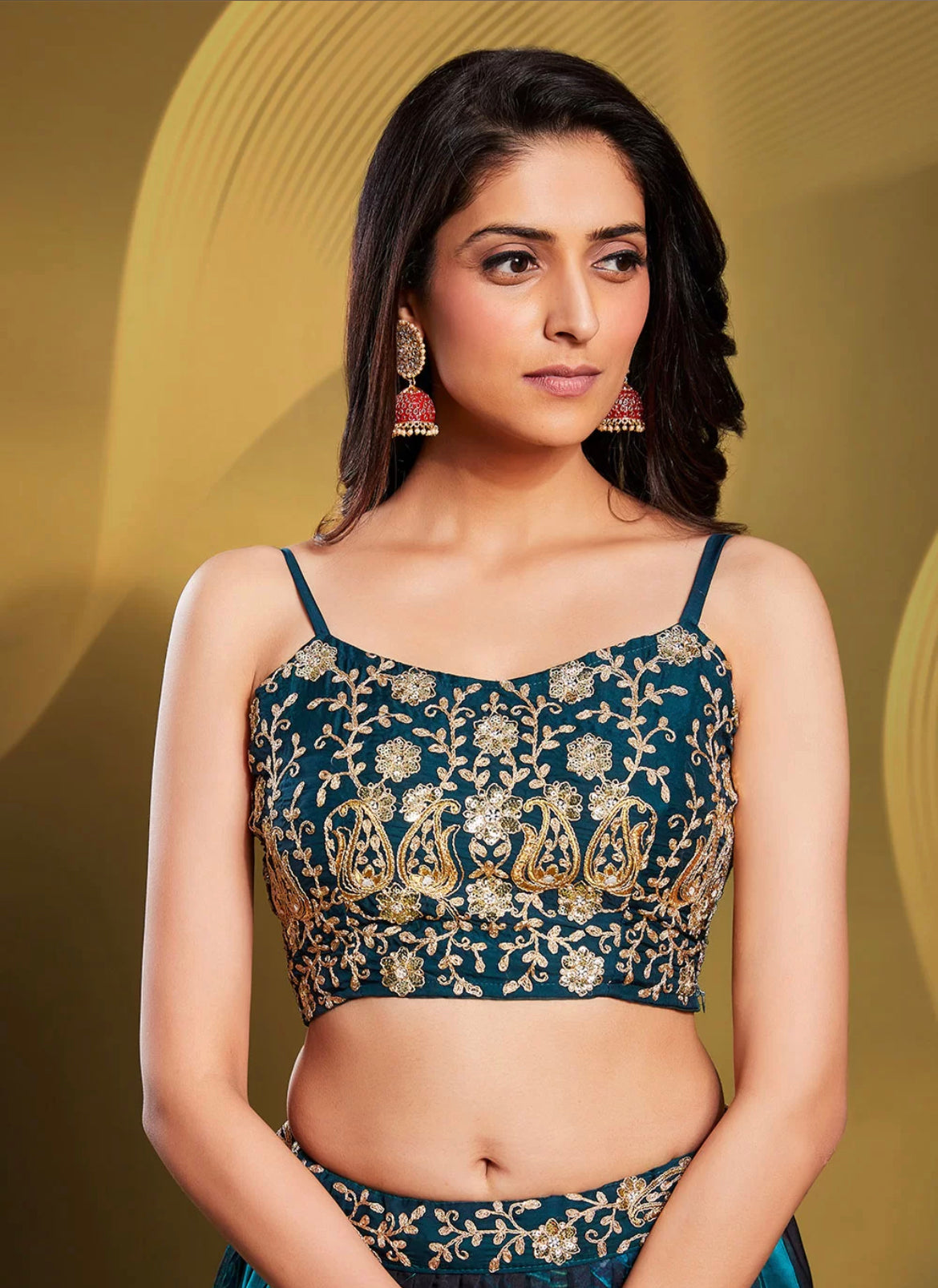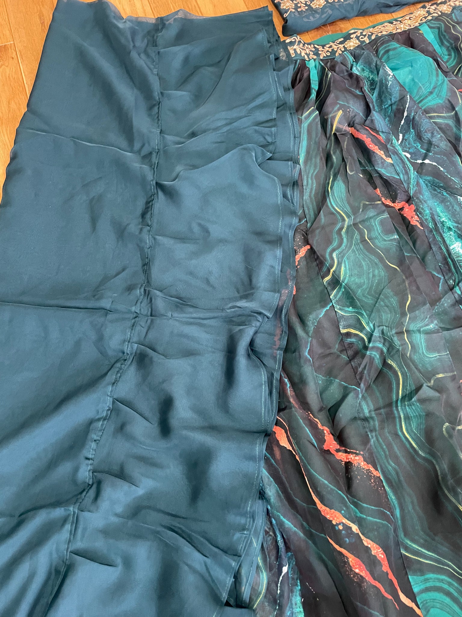 Organza lehenga semi stitched up to 42 inches waist and 42 inches length. Cancan attached.