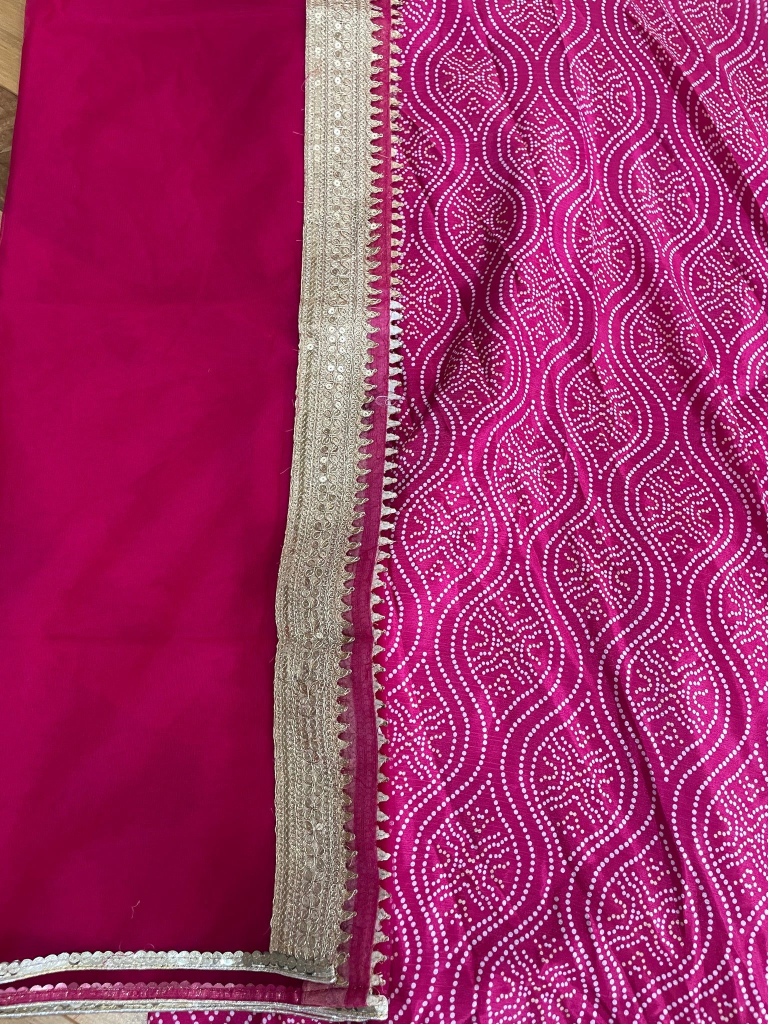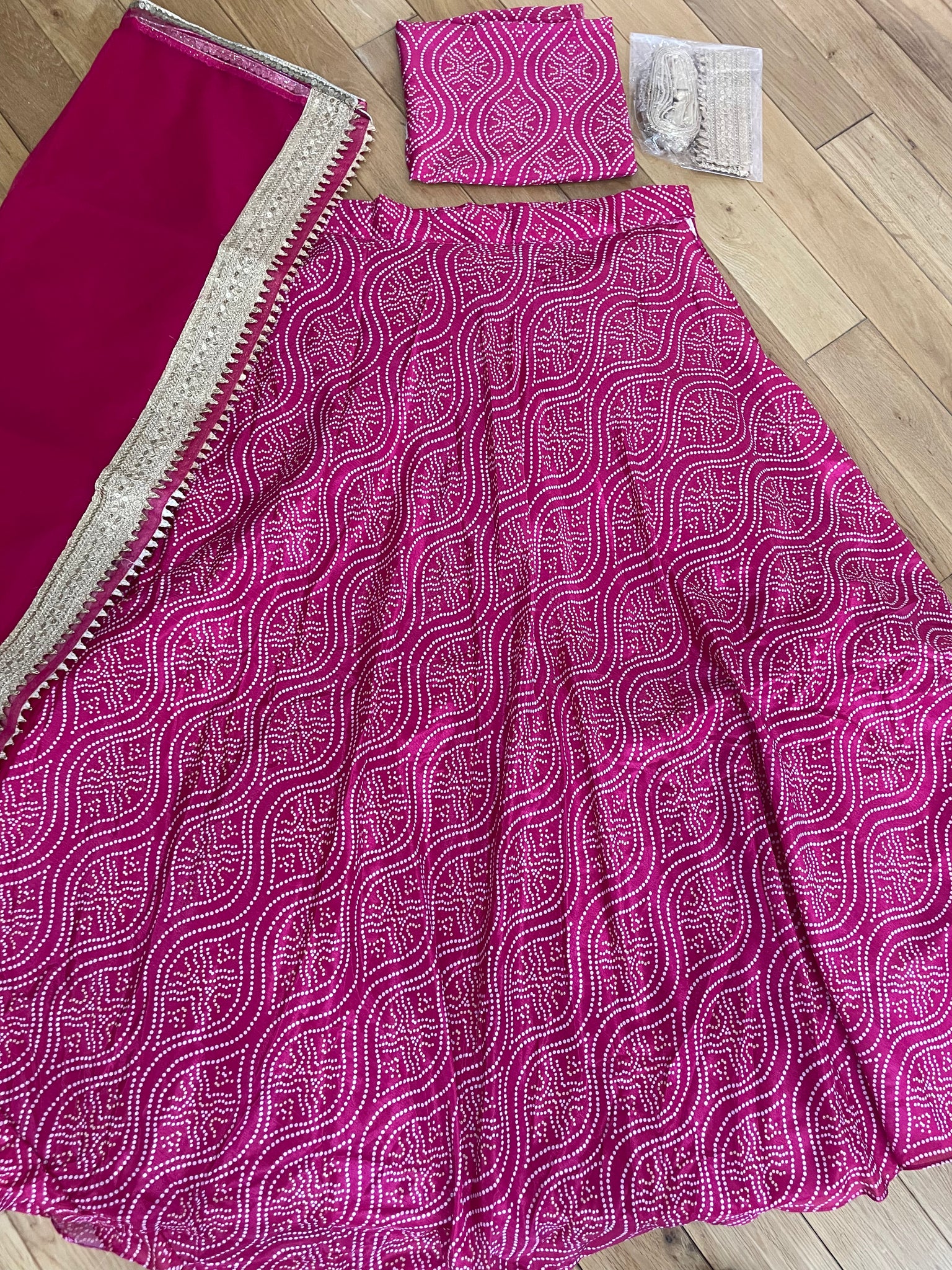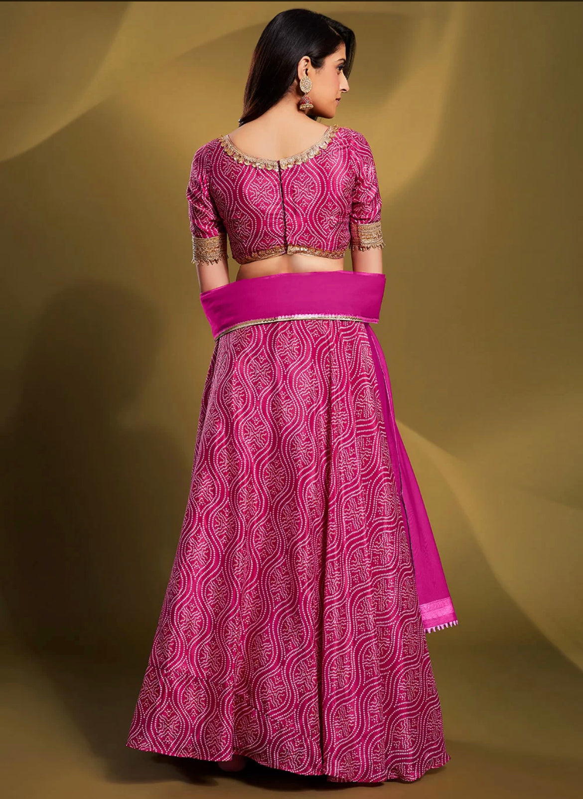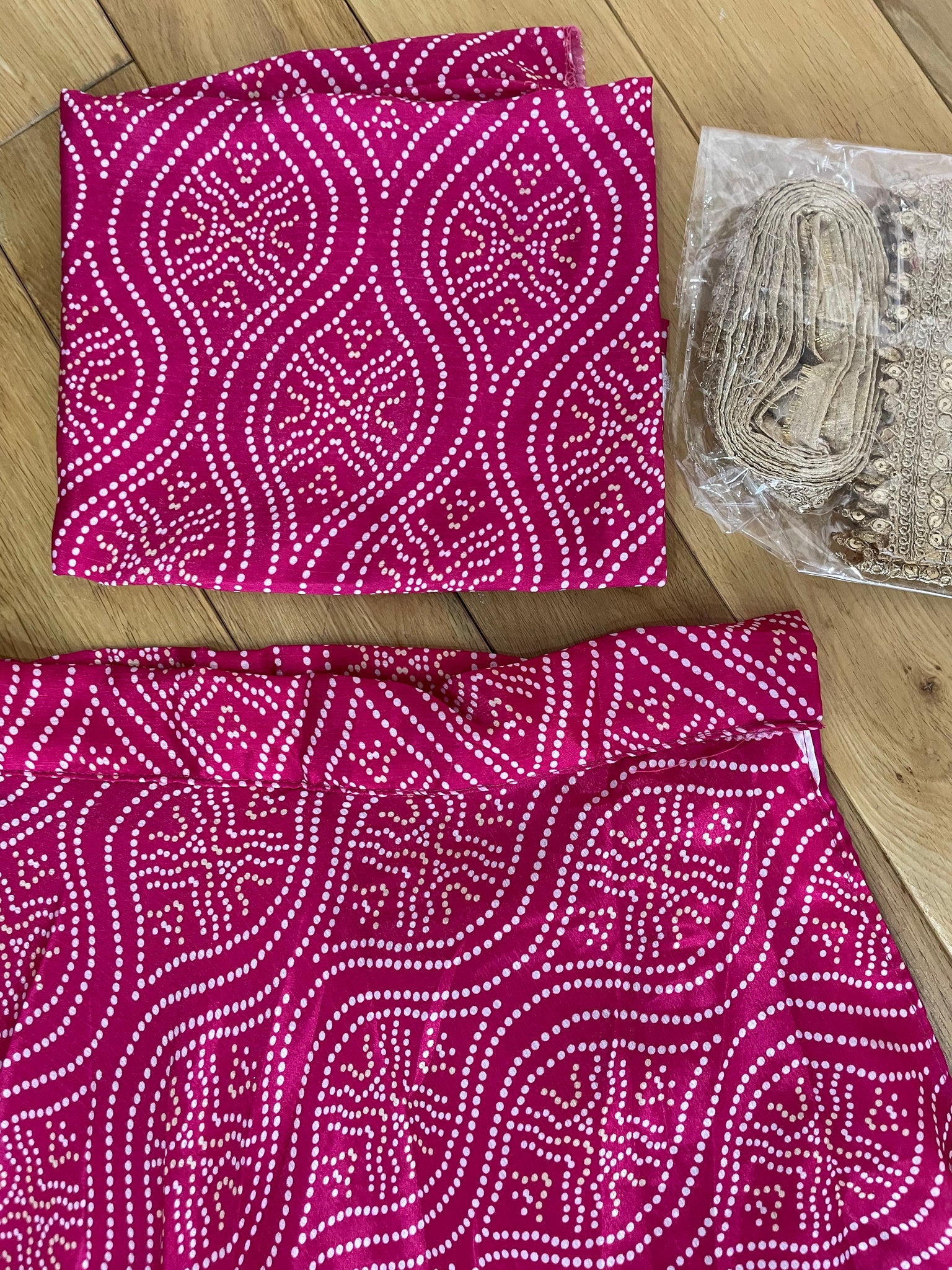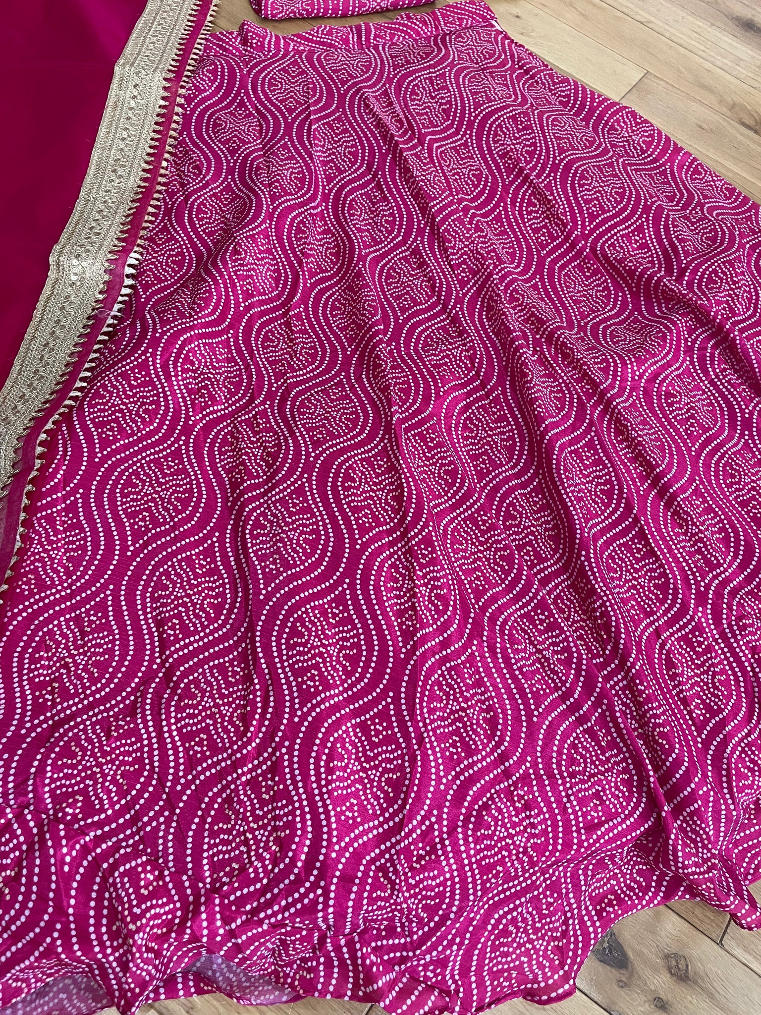 Crepe printed silk Lehenga and crepe blouse piece. Soft net dupatta. Blouse can be done in your style as it’s just a blouse piece.