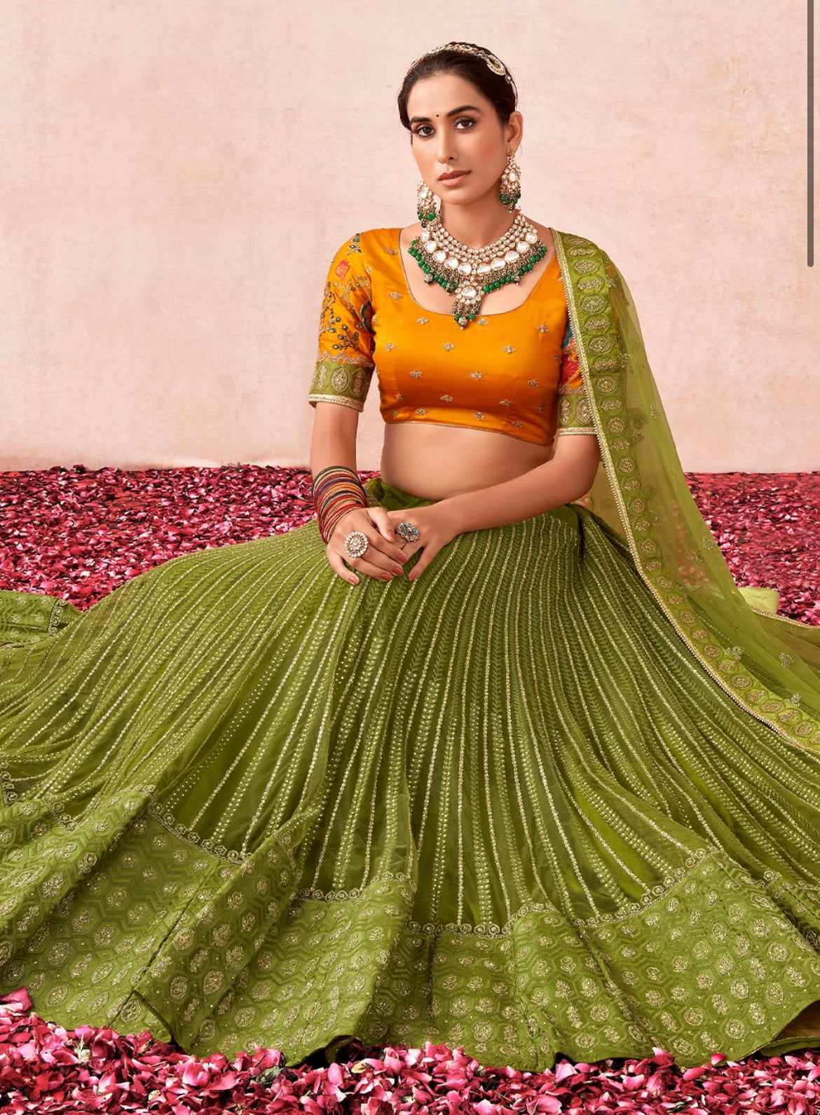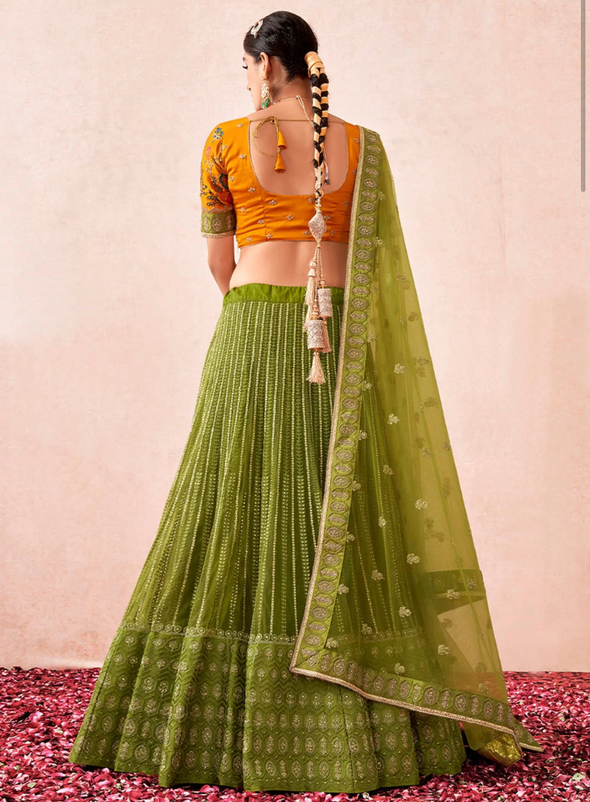 Semi stitched skirt and 1m blouse supported up to 56 inches bust. Lehenga length 44 inches.