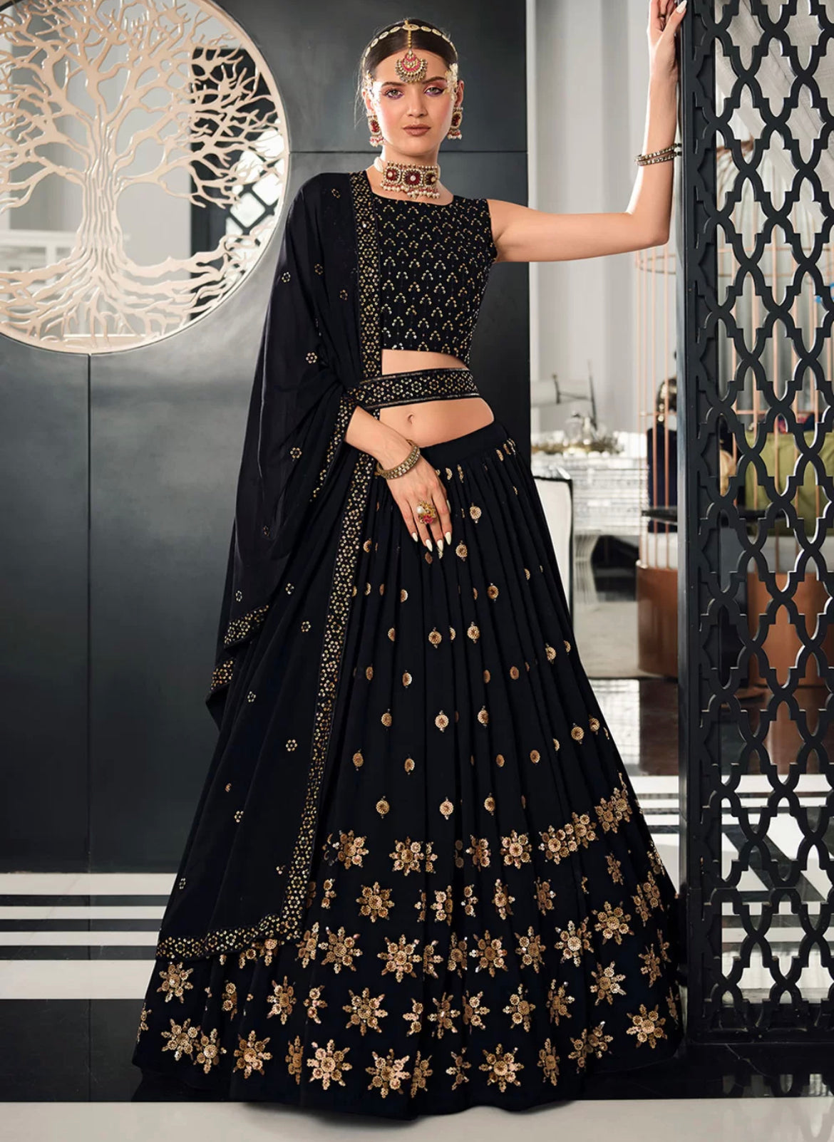 Semi stitched georgette Lehenga supported up to waist 42 inches and length 42 inches.