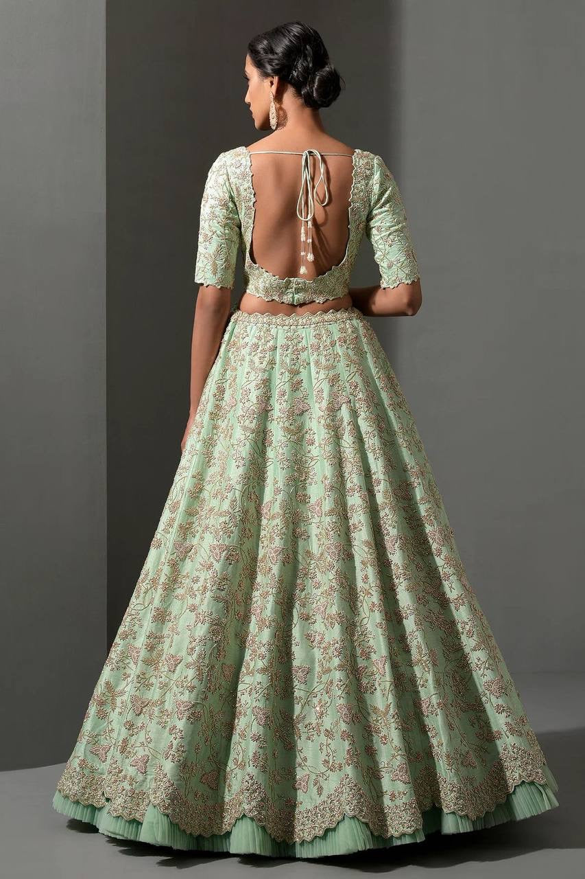⏭️ Mulberry silk lehenga with sequins , thread & dori work + net ruffle work