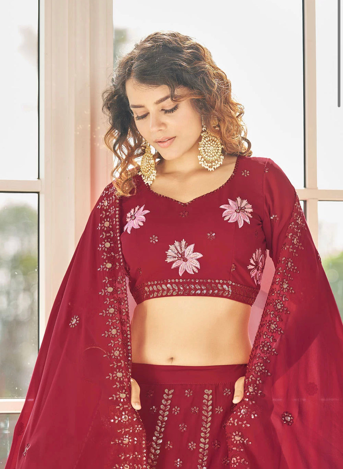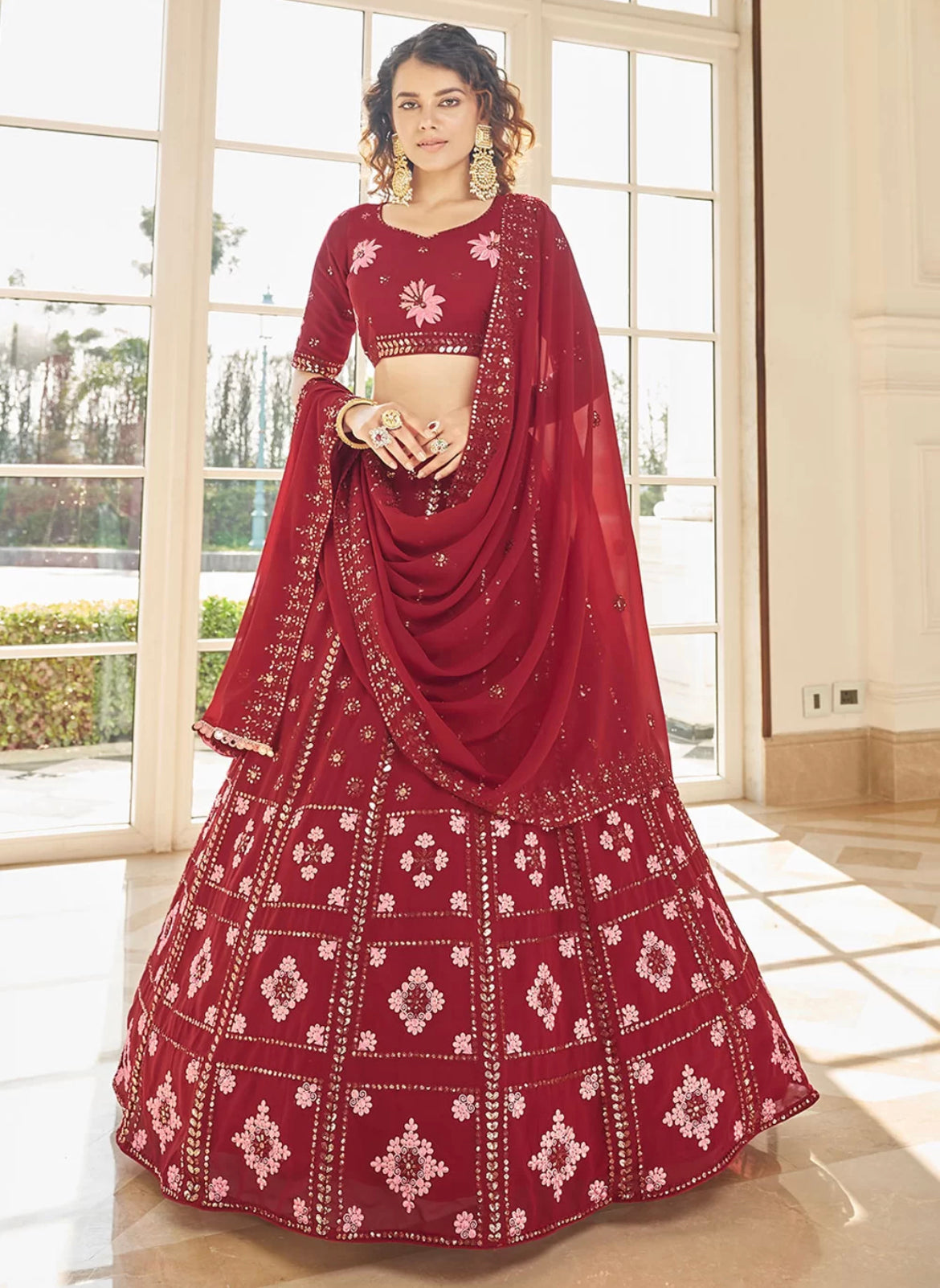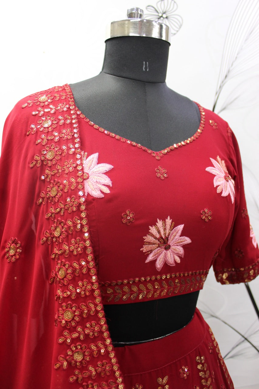 Lehenga fabric and work: georgette, thread work with sequins embroidery