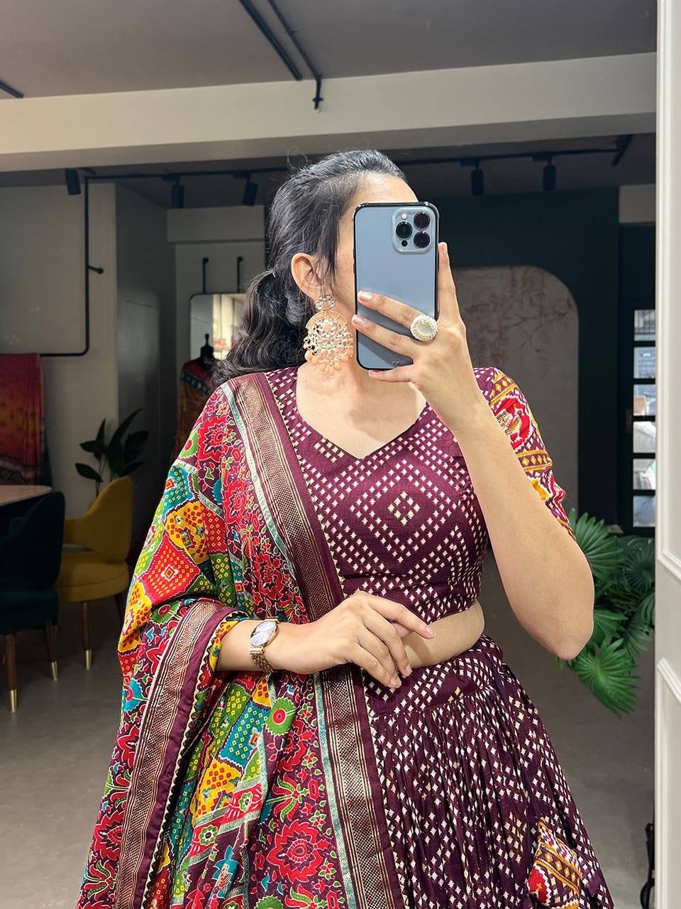 Royal ensemble of bandhej and patola print Lehenga in wine