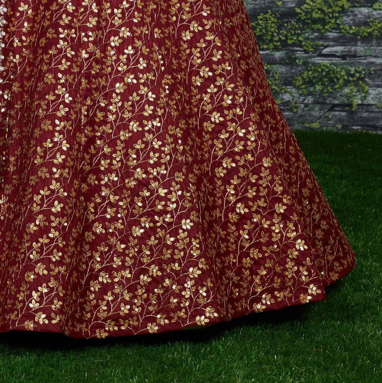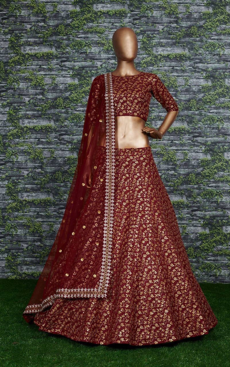 Featuring a Maroon [color] Raw silk lehenga with golden zari embroidered in vine pattern accentuated with golden sequins all over.