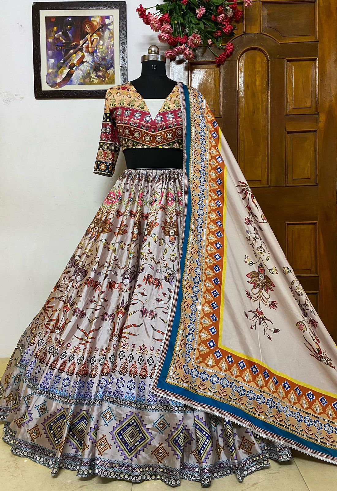 # LEHENGA : HEAVY TAFFETA SILK WITH *DIGITAL PRINT * & * (5 MTR FLAIR ) *FULLY STITCH * WITH * REAL MIRROR WORK* (44 INCHES LENGTH)