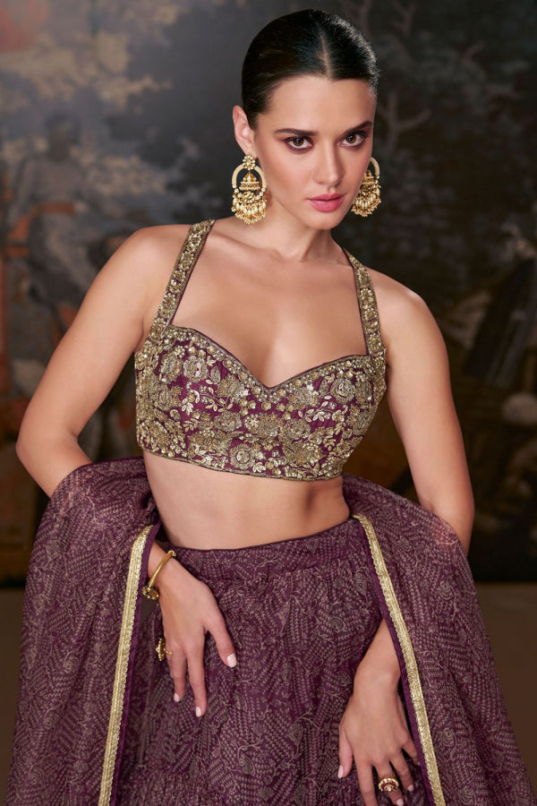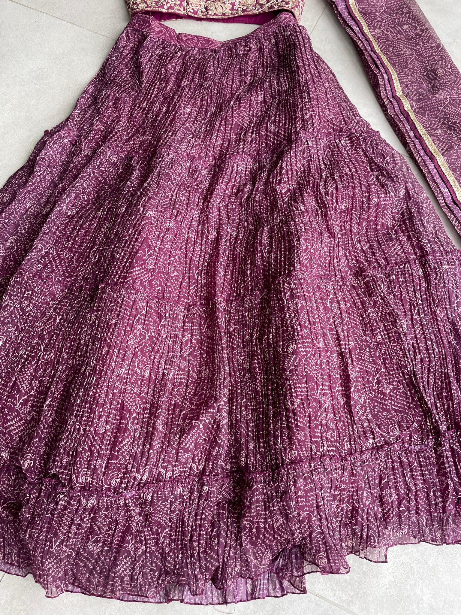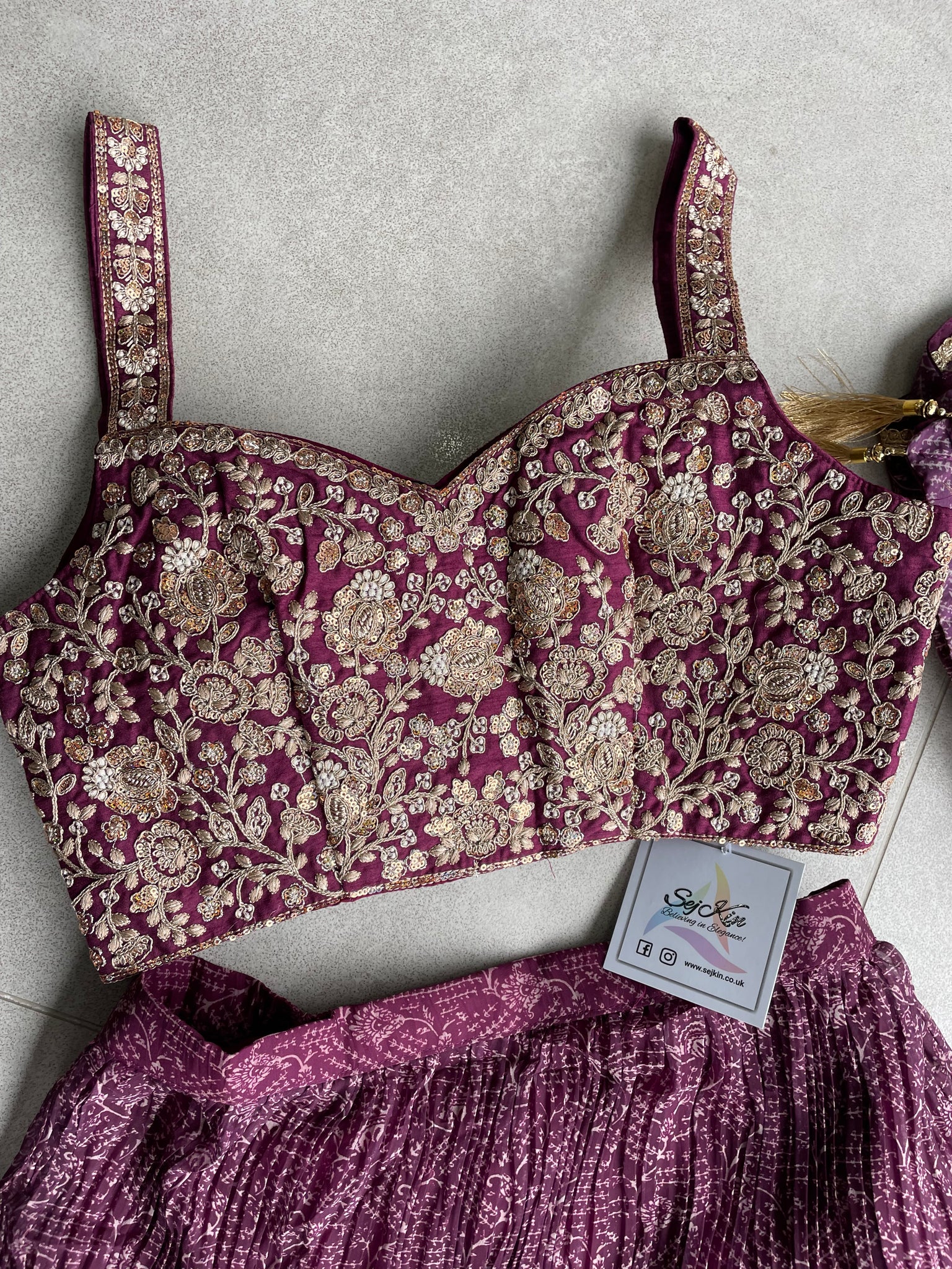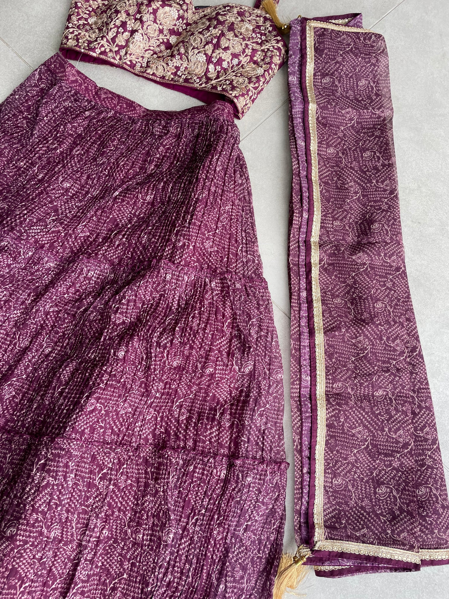 Wine tiered Organza silk readymade Lehenga (elbow sleeves attached)