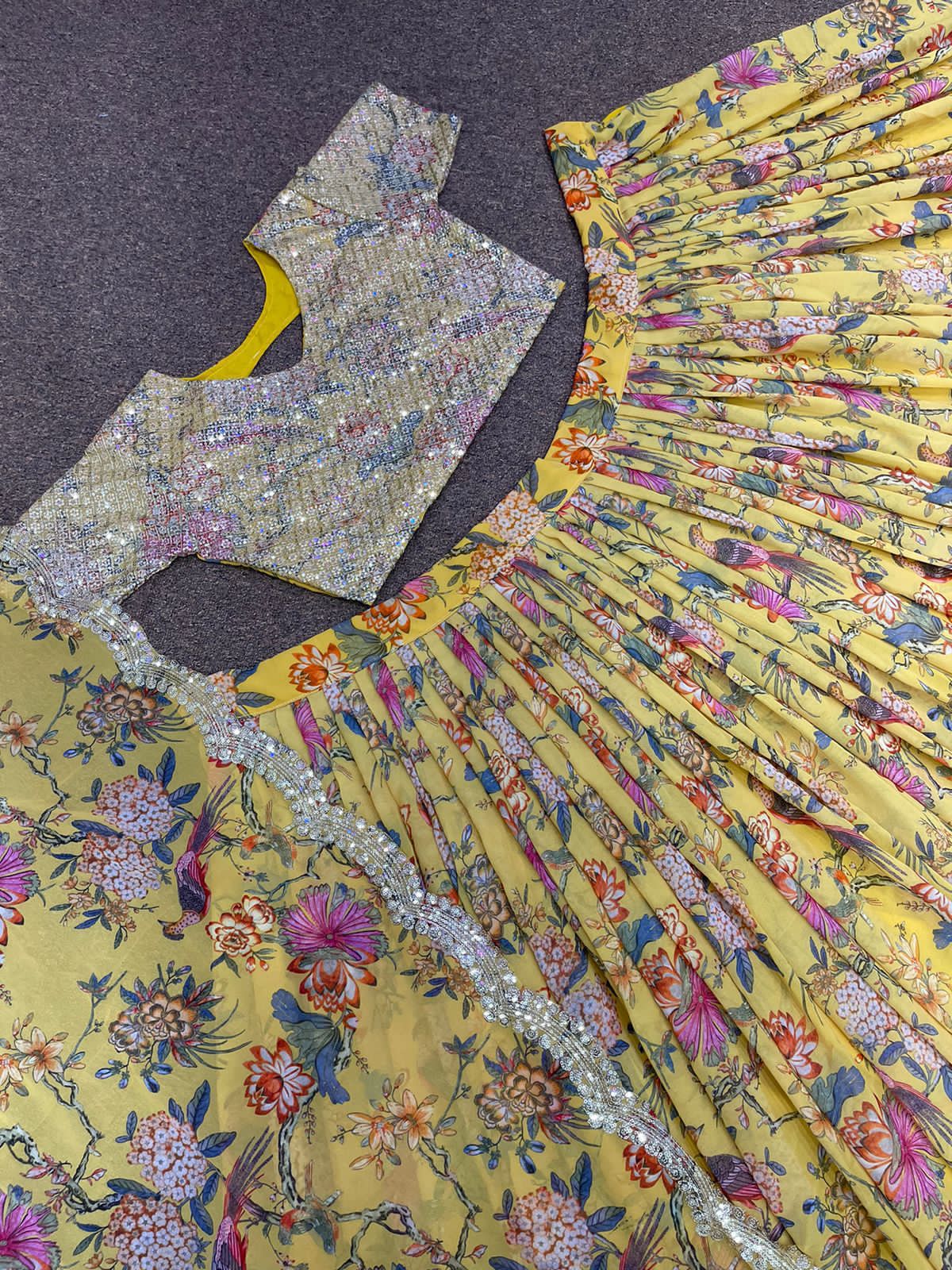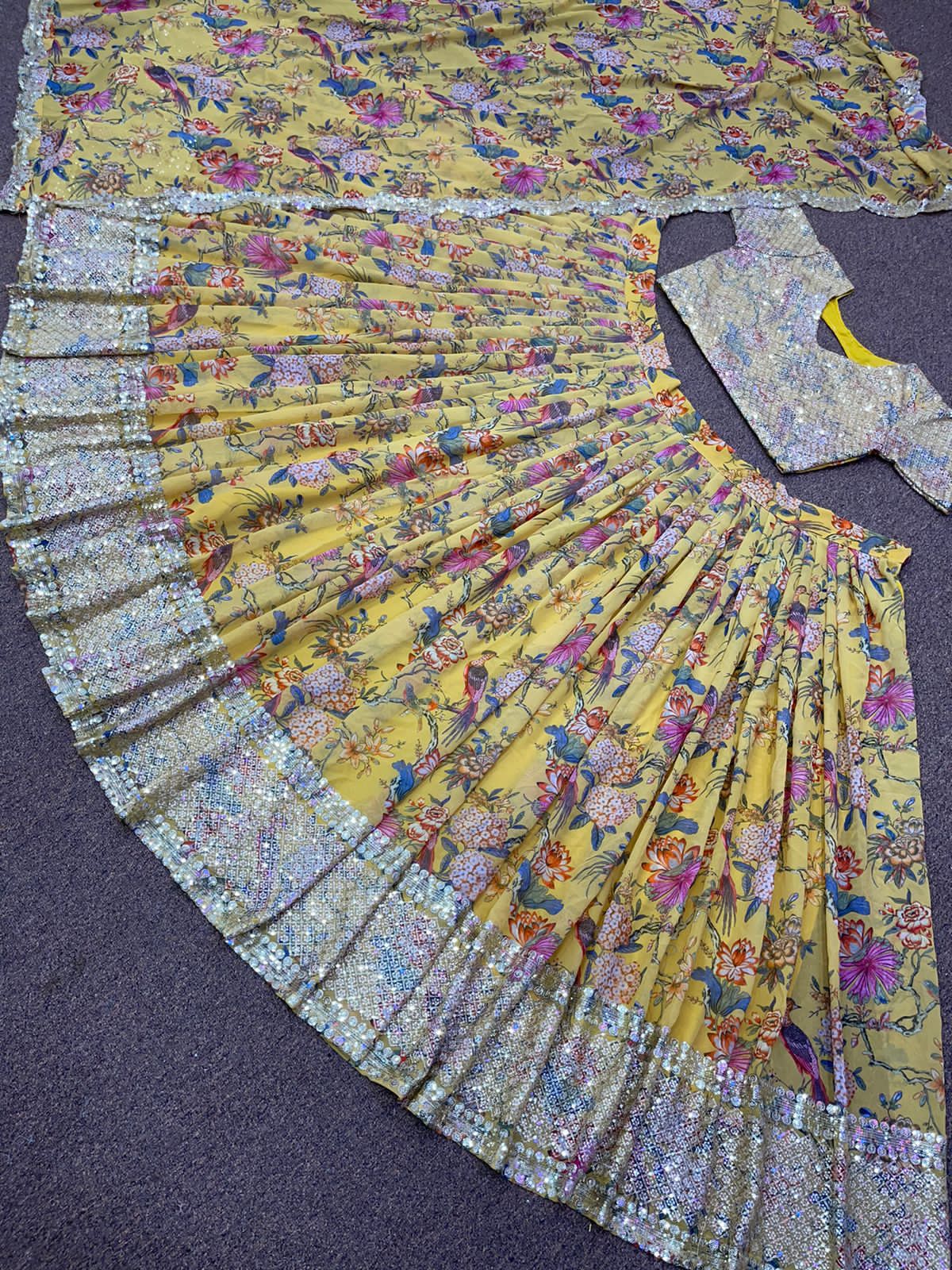 Yellow Lehenga - Floral and bird digital print Lehenga